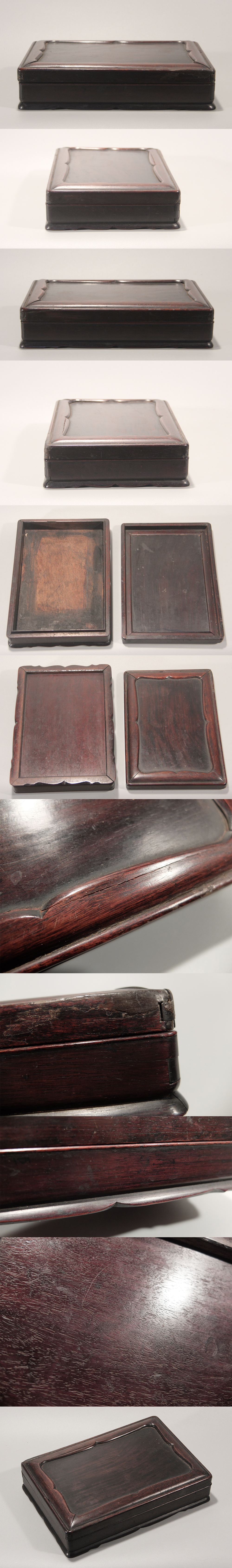 | 商品説明 | 紫檀 硯箱 です。 詳細は写真をご参照ください。 <サイズ> 【外寸】高さ:約5.8cm、縦:約23.6cm、横:約16cm 【内寸】縦:約21.8cm、横:約14.5cm ※詳細は写真を見て、ご納得の上ご入札願います。 ご不明な点はお気軽にご質問ください。 ※ノークレーム・ノーリターンでお願いします。 ※サイズの若干の誤差はご了承ください。 |