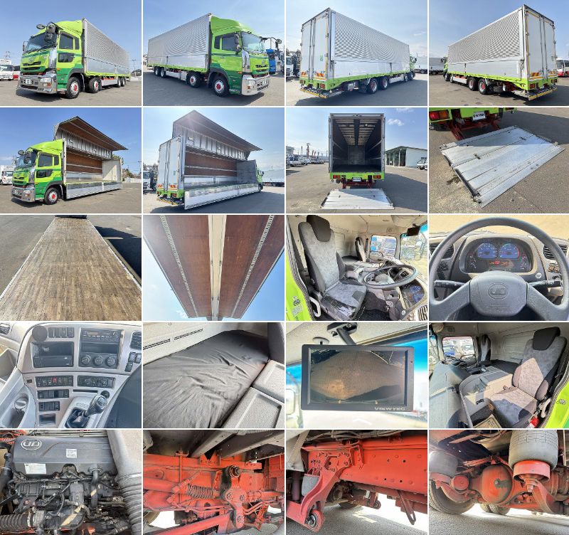 格納PG付アルミウイング 上物:フルハーフ製 4軸低床 荷台寸法:964×240×265 荷台床:板張り 積載12.7t 後輪エアサス 格納PG付 バックカメラ ATシフト(2ペダル) 走行82.6万㎞ 排ガス適合(各都市登録&乗り入れ可) 大型免許対応車 |