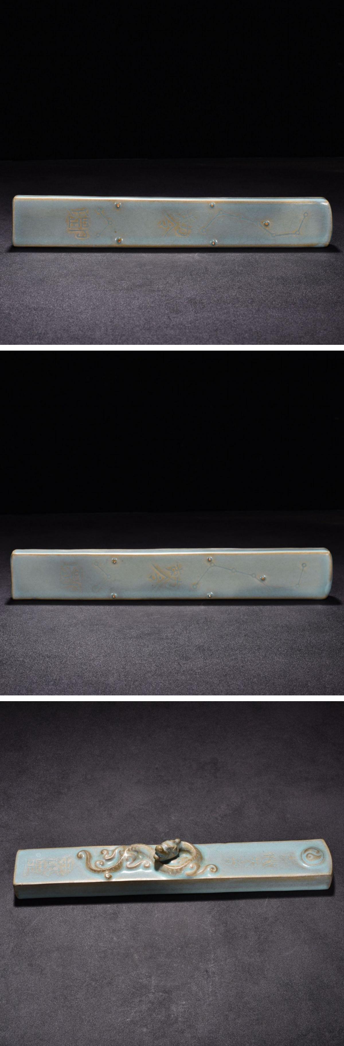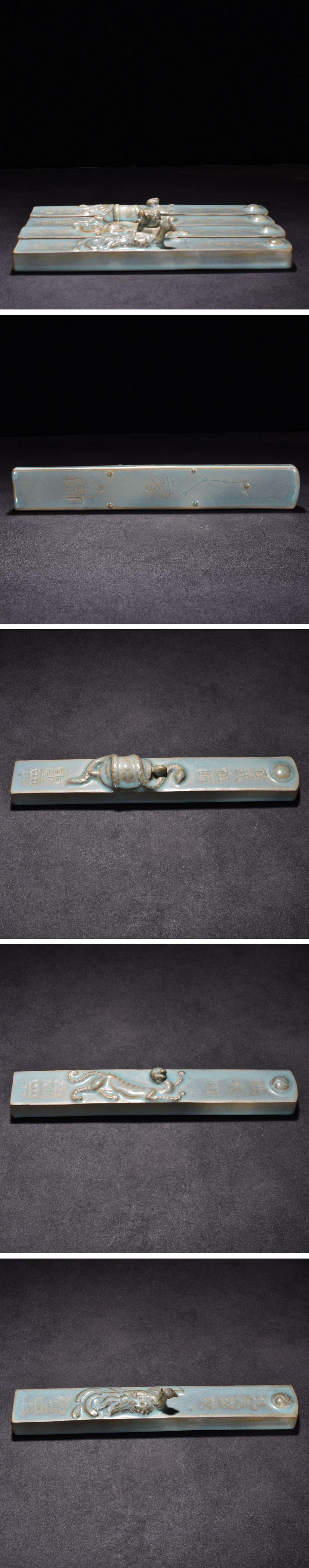 【雲錦】1円から 宋時代 汝窯 天青釉 四神獣文鎮紙 古書道具 時代物保証 古美術 骨董品8L21-8S4