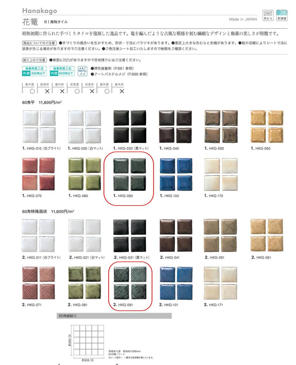 | 商品説明 | ご覧いただきありがとうございます。 特注品のタイルになります。 特注品 花篭MIX (HKG-090、HKG-091) タイル実寸法 58×58×10(1シートに20枚連結)※305㍉×305㍉/シート 1ケース10シート入り(0.9㎡) 独特な形状で表面が盛り上がっていて、微妙に大きさ、形、厚さが違います。 特注で造ってもらった物なので他では手に入らないと思います。 平タイルと模様のタイルをバランス良く配合しておりデザイン性に優れています。 色合いは写真をご覧ください。 ★表面に紙張りしてあるので貼り付け後、紙を濡らして剥がして下さい。 紙糊が強めなので紙剥がし後タイル表面をスポンジ掛けした方が良いです。 昭和初期に作られた手作りタイルを復刻した逸品です。 篭を編んだような古風な模様を刻む繊細なデザインと釉薬の美しさが特徴です。 全部で4ケースあります。全部落札頂いた場合半端のタイル(1枚使用した残り9シート分)お付けします。 わからない事があれば質問ください。 よろしくお願いします。 その他タイル、石材等出品しておりますので興味のある方は覗いてみてください。 |