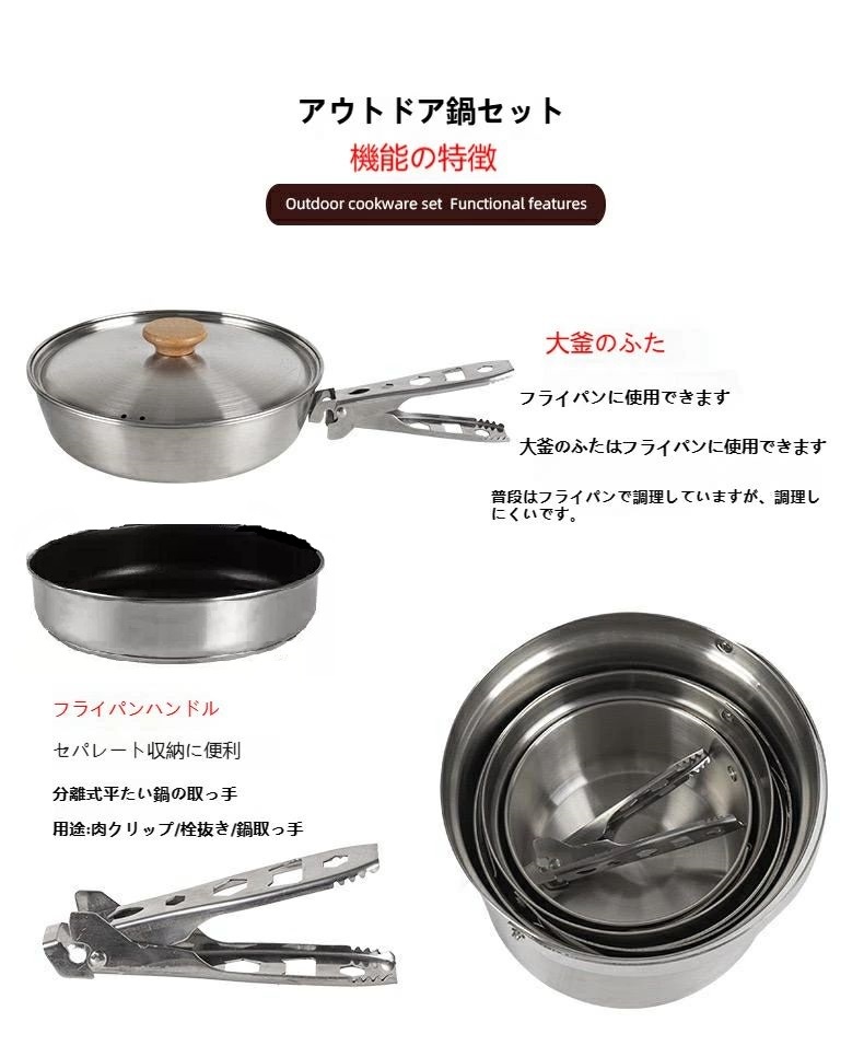 | こちらはGENERIC OUTDDOR フィールドクッカー9点セットになります。アウトドア・レジャー等で活躍するクッキング鍋セットになります。 焚き火台などでトライポットに吊り下げて使用することもできるステンレスクッカーのセットです。 炊・焼・茹・揚・蒸・炒・煮 全てをこなすオールインワンステンレスクッカーでアルミ製とは異なり衝撃に強い優れた耐久性を誇るステンレス製で、焚き火でも気にせずガンガンお使いいただけます。 スタッキングできて持ち運びに便利なコンパクト収納、約4人~8人までの料理等に対応しているため贅沢にアウトドアークッキングをお楽しみいただけます。 収納に優れた鍋セットを贅沢にアウトドアークッキングをお楽しみください。 商品詳細 ブランド:GENERIC OUTDDOR 品番:GO-CS002 サイズ収納時:約φ22.5cm×22cm ・ステンレス片手小鍋:φ15×8cm 容量1.4L ・ステンレス大鍋:φ20.5×高さ5cm 容量5L ・ステンレスケトル:φ14×高さ13cm 容量900ml ・フライパン:直径262×77cm ・メッシュバスケット:直径19cm×高さ10cm ・ハンドル:長さ14.5cm 重さ:約2.1kg 材質:304ステンレス銅+201ステンレス銅 セット内容:大鍋1点・ケトル1点・片手鍋1点・メッシュバスケット1点・フライパン1点・ハンドル1点・鍋蓋大1点・小蓋1点・収納ケース1点 ※商品写真はお使いのモニター環境設定、お部屋の照明等により実際の商品と色味が異なる場合がございます。 ※サイズ・重量などの数値には若干の個体差があります。 ※細部のデザインは製造ロットにより予告なしに若干変更になる場合がございます。 何卒ご了承願います。 ※海外輸入品に付きスレ、キズ等がある場合がございますので、何卒ご了承願います。 ※良いものをより安く提供できるよう、エコ梱包させていただいております。 | |||