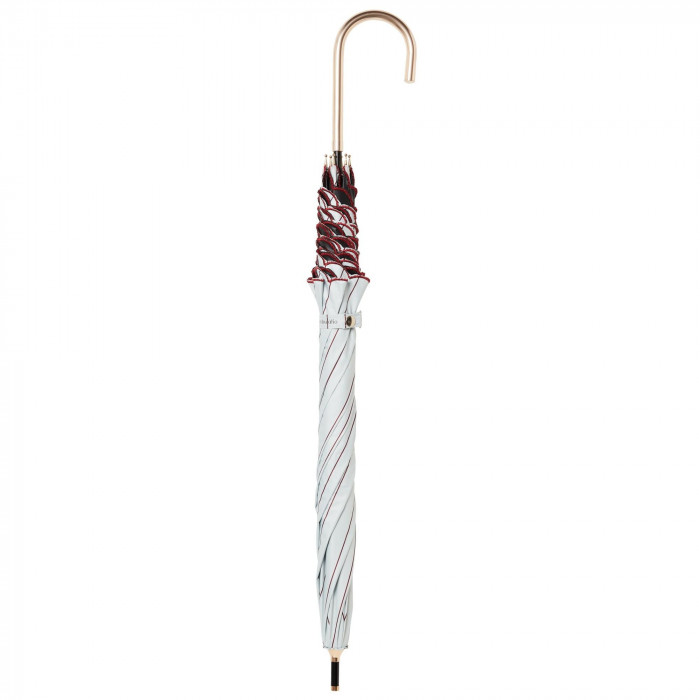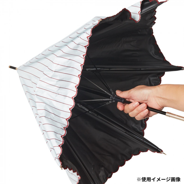 | 人ごみの中でも使いやすい大きさと軽さの傘。UVカット率99.9%、高い遮光・遮熱性。マルシェの屋根をイメージしたパターン。細いストライプと裾の刺繍が繊細でこだわりのあるデザインです。 |