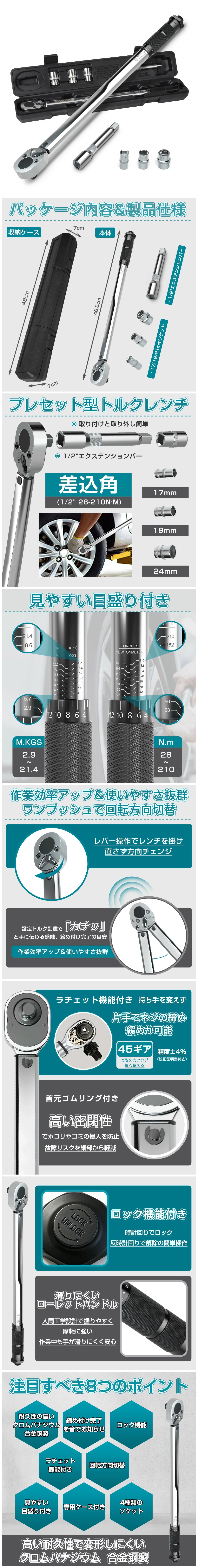 ▲【商品内容】トルクレンチ本体、アルミホイール対応17/19/21mmソケット 差込角: 1/2インチ エクステンションバー ▲【信頼性と高精度】精度は±4%以内を満たします。各レンチには検証コードがあり、日常使用には信頼性が高く正確です。 ▲【正逆転&読みやすいスケール】作動トルクの安定性を調整した後、ロックできます。正逆転可能なヘッドなので、非常に便利です。設置目盛もほかのレンチよりもっと高精度、細工も精巧でトルク変更、によって容易に行えます。 ▲【品質保証と使いやすい】耐久性の抜群である ▲【本体】カーボンスチール・スチール / 【ソケット・エクステンションバー】クロームバナジウムを採用し、防錆で十分に丈夫である。ハンドルは防錆および滑り止めのためのナーリングなので、握り心地が良くて、使いやすいです。 ▲【目盛】はっきりと読みやすい。目盛によってトルク変更は容易に行え! ▲トルク設定範囲:28~210N・m ▲密閉構造でホコリの侵入が少なく長期間にわたり高精度を保ちます。 |