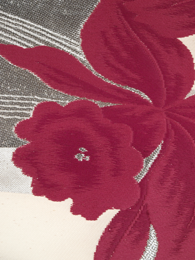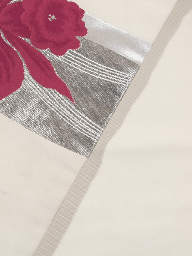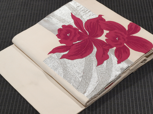 全体的な印象としては、ややきなり色がかった白色といった感じの地に、銀色の角と蘭の文様が織り込まれている、西陣織の名古屋帯です。 ほぼアンティークといってよいお品です。大ぶりの蘭が人目を引きますね。 結びジワがあるほか、画像では判別はつきませんが、こまかな細い筋状に変色した織糸が全体のところどころに織り混ざっています。また、お太鼓の裏に回る部分や胴回りの内側、裏側などに長さ約 10cm の色うつりなどの薄めのよごれがちらほらとあります。前の左下にこまかな織りキズはあるものの、お太鼓やたれ、前などに目につく大きなしみやよごれ、褪色などのダメージはないので、気にされない方であればご着用可能かもしれませんが、状態ランク=「D」のご着用対象外、リメイク素材用とさせていただきます |