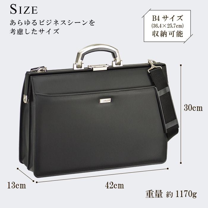 | 商品説明 | ◆ビジネスの主流、上品で風格のあるしっかりした作りの日本製ダレスバッグ。 ◆大開きく開く開口部は中のものが見やすく、取り出しやすくなっています。 ◆B4サイズ(36.4×25.7cm)が収納可能!仕事で必要な資料や書類を収納・持ち運ぶには扱いやすいサイズ。 ◆多様なポケットがあるので、資料や書類・小物まで整理整頓がしやすい機能が充実! ◆しっかりと自立し、合皮との組み合わせで雨にも強く、鞄本体が汚れにくくなっています ◆鍵も付いているので貴重品もきっちりガードしてくれます。 ◆ショルダーベルト付属なので、肩掛けでもお使いいただけます。 【 こんな方におすすめ 】 ◆多少の雨にも強く、長く使える飽きのこないデザインをお探しの方へ。 ◆仕事関係の書類や資料が多く、荷物の整理や取り出しなどスムーズに行いたい方へ! ◆父の日、バレンタイン、クリスマス、誕生日などのプレゼントにも最適! 【 商品詳細 】 サイズ : 横幅42×高さ30×厚み13 [cm] 重量 : 約1170g 素材 : 合皮 (ハンドル/アルミ合金) カラー : 01-黒 生産国 : 日本製(兵庫県豊岡市で生産) 正面 : ファスナーポケット 本体内部 : アテポケット、ファスナーポケット付き中仕切り、マチ付きポケット、小物ポケット、ペン差し その他 : ワンタッチ錠前(鍵が1つ付属)、肩アテ付きショルダーベルト、底板 現在お試し大特価、送料無料、値引き中でお買い得となっています。 ※ 予告なく仕様変更する事がありますのでご了承下さい。 |
