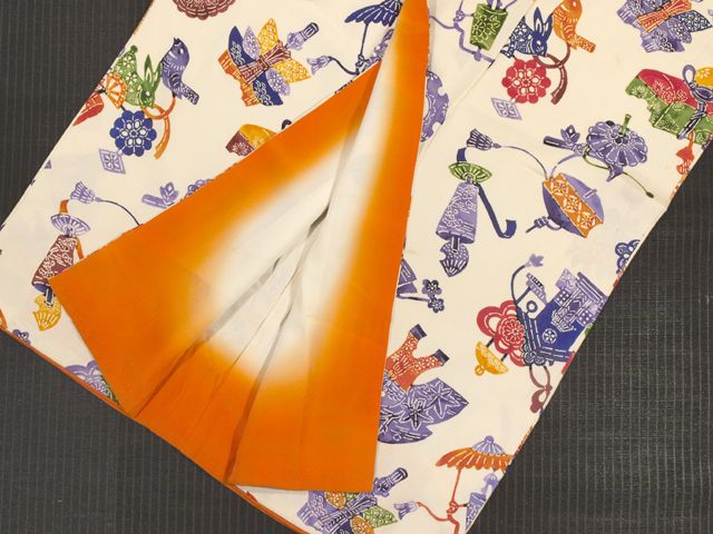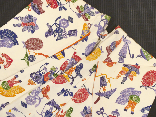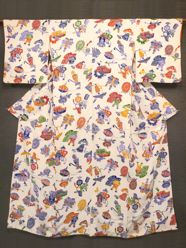 きなり色がかった白色の地に、玩具(おもちゃ)や文箱、閂(かんぬき)などの器物の文様が型絵染めされている縮緬の小紋です。袷仕立てです。 小鳥と兎の人形が愛らしいですね。版画のような趣が素朴な雰囲気を醸していて、おもしろみが感じられます。シボの大きな縮緬地です。 ユーズド品で、下前身ごろの胸に長さ約 1-5cm のよごれが数か所、両衿山にうっすら黄変、上前身ごろの膝下に長さ約 5cm のうすよごれが 1 か所、左後身ごろ裾上直径約 10cm の範囲でうすよごれがポツポツとあります。また、胴裏のところどころに強い黄変が広くあるほか、裾へりにうすよごれが若干あります。全体のところどころにもこまかな黄変やよごれ、色うつりがちらほらとありますが、そのほかに目につく大きなしみやよごれはありません。状態ランク=「D」のご着用対象外、リメイク素材用とさせていただきます。 |