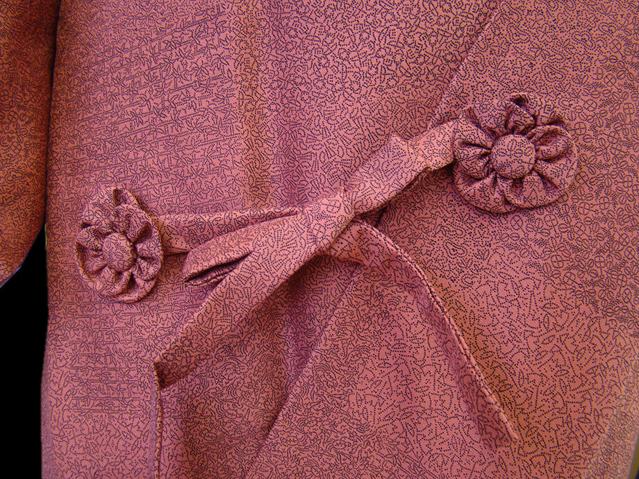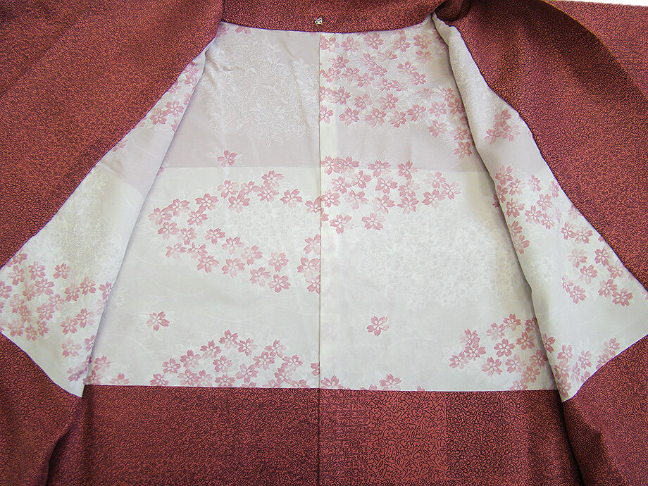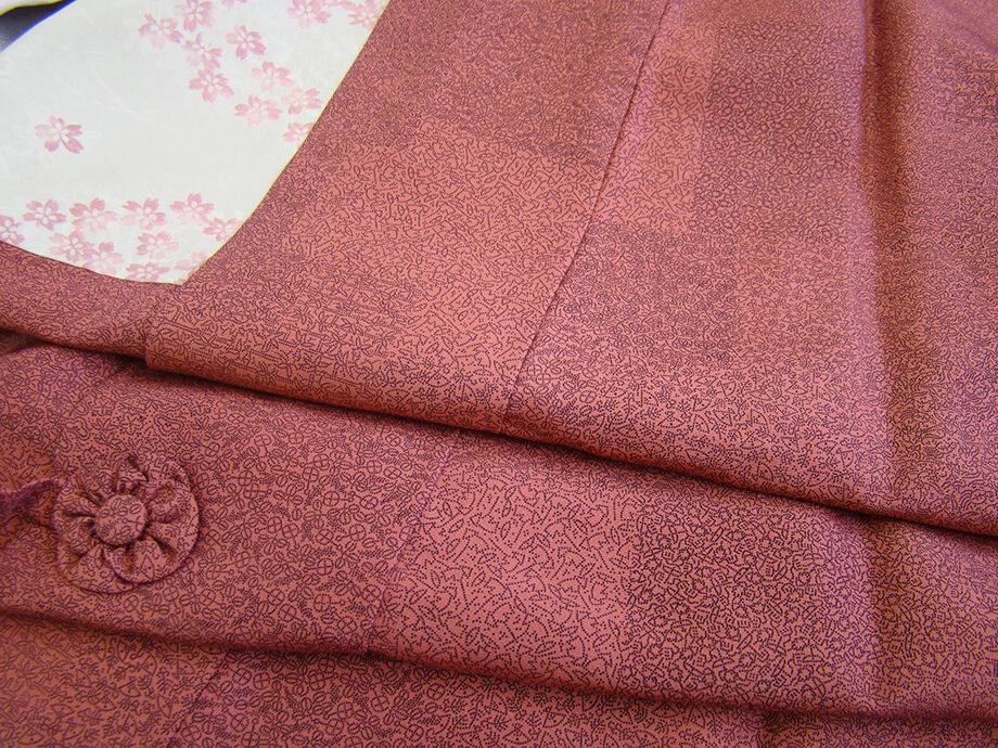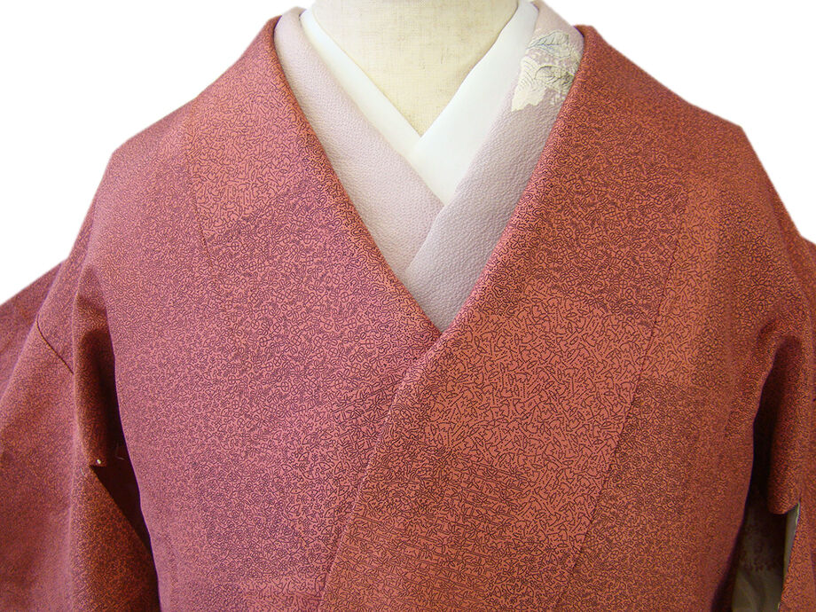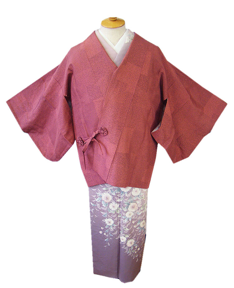 | 商品説明 | しなやかなさらりとした手触りの着心地良い一越地の道行コート。 浅蘇芳色地に黒色の寄せ柄の江戸小紋柄の染柄。 手縫い仕立。 肩裏も正絹。 |