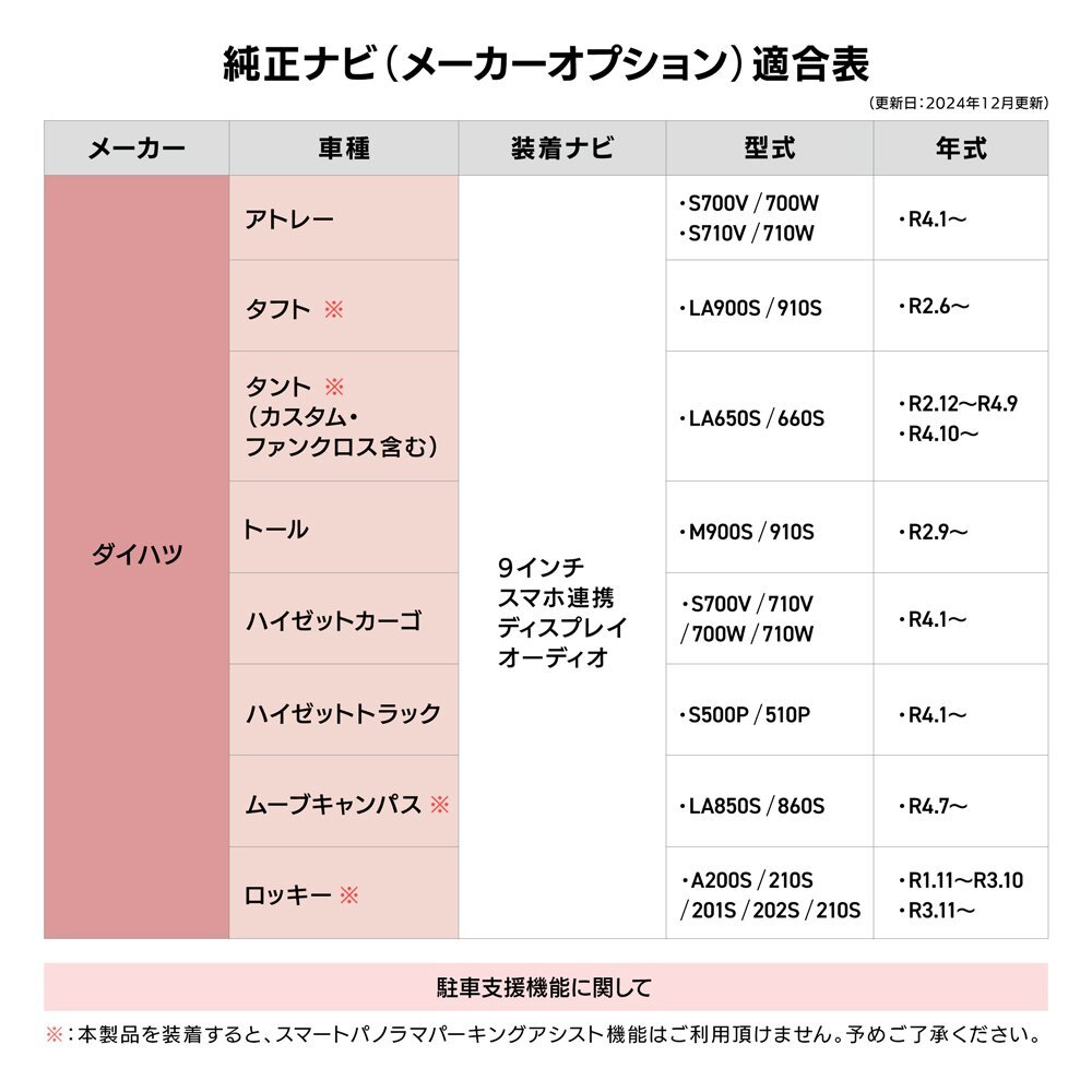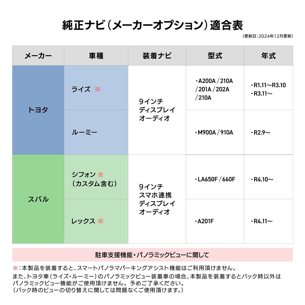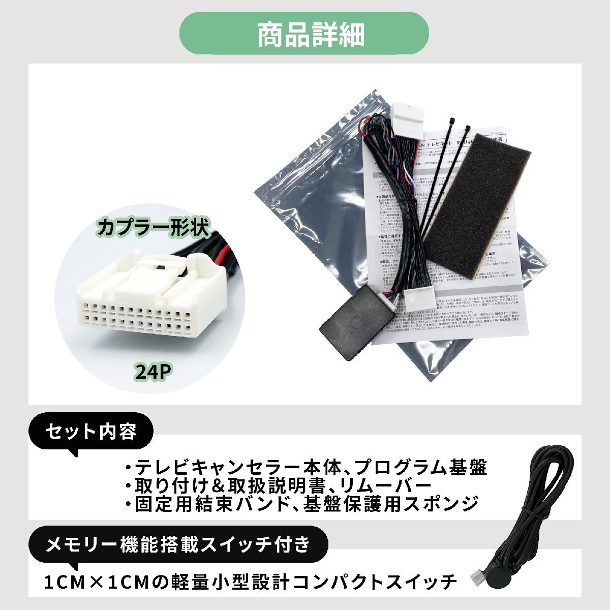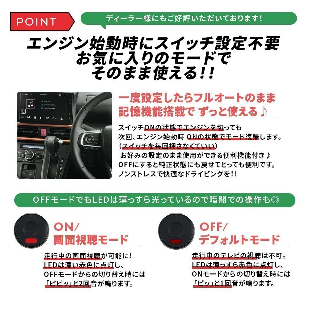 ![]() ![]() ダイハツ/トヨタ/スバル純正 メーカーオプションディスプレイオーディオナビ対応 当店のテレビキットを装着すると… リモコンの切り替えで走行中にテレビ/DVDが見れる!ナビ操作ができる! 簡単に取り付けられるカプラーオンキットです☆ リモコンのスイッチをカチッと押すだけで、 簡単にテレビ視聴モードのON/OFFを切り替えることが出来ます。 OFFモードでもLEDは薄っすら光っているので暗闇での操作も◎ 【OFF/デフォルトモード】 テレビキャンセラーが 動作していない状態。 走行中のテレビの視聴は不可。 LEDは薄っすら赤色に点灯し、 ONモードからの切り替え時には 「ピッ」と1回音が鳴ります。 【ON/テレビ視聴モード】 テレビキャンセラーが 動作している状態。 走行中のテレビの視聴が可能に! LEDは濃い赤色に点灯し、 OFFモードからの切り替え時には 「ピピッ」と2回音が鳴ります。 【適合車種】 ・アトレー ・タフト ・タント ・トール ・ハイゼット ・ムーブキャンバス ・ロッキー ・ライズ ・ルーミー ・シフォン ・レックス 詳細は適合表をご確認ください。 ▼こんなお悩みはございませんか? ・車が走り出したらテレビ&DVDが見れない! ・長い渋滞で同乗者がイライラ ・長距離ドライブで子供がぐずる ・ナビ操作もしたい! → 当店のテレビキットを取り付ければすべて解決します! ◎ 走行中でもテレビ/DVDの視聴OK! ◎ ナビ操作OK! ・取り付けが難しそう… →当店のテレビキットはカチッと取り付け簡単なカプラーオンタイプ! ◎もし必要がなくなった場合もすぐに取り外せます。 ◎車検も問題ございません。 ■テレビキットについて 当製品は走行中に助手席、後部座席の方の利用を目的として販売しているカプラーキットです。 運転者が走行中にモニターを凝視することは安全運転義務違反になり、大変危険ですのでおやめください。 また、走行中のナビ操作も助手席の方が行ってください。 ※取り付けの際は万が一のため、バッテリーの接続を外すなどのうえ、作業してください。 お取り付けに関するサポートは行っておりませんのでご了承ください。 また、取り付けたことにより発生した事故・故障・損害は一切保証できませんので お取り付けは整備工場などで行い、あくまで自己責任のうちで取り付けを行ってください。 (作業ミスなどの責任は負いかねます) ![]() ![]() 適合表に記載の機種以外の適合情報は当店ではわかりかねます。 |