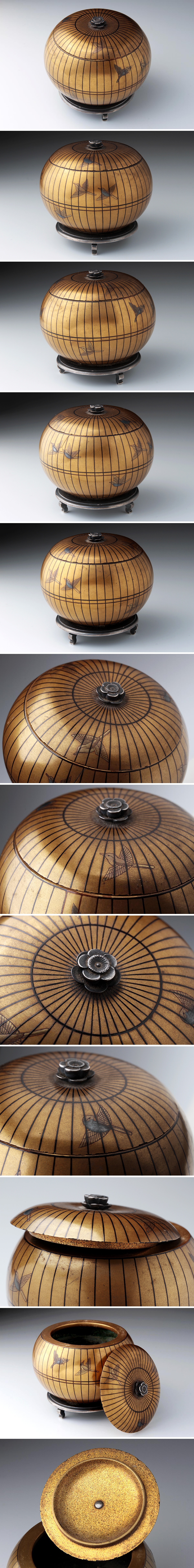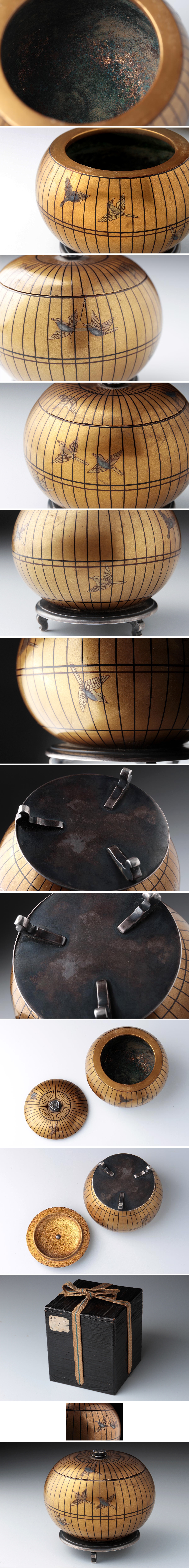 | ◆ 時代蒔絵 梅銀摘 金地 千筋鳥蒔絵 鳥籠形 銀製三足香炉 高6.5cm / 重120g 木箱附・蒔絵銀三足香爐 明治期 漆工芸 漆器古美術 ◆