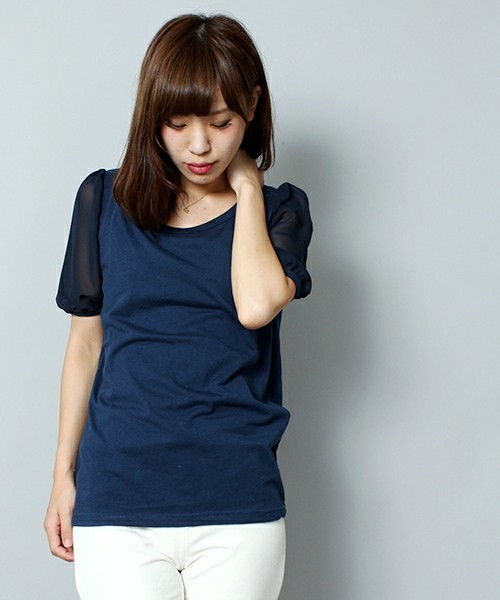 | ★新品未開封!袖シフォンパフスリカットソーネイビー系サイズF/WEGO/Browny★ | ||||