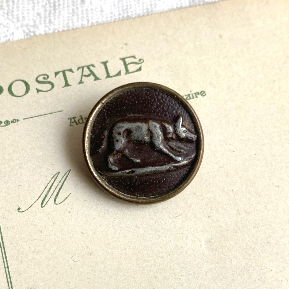 PayPayフリマからご覧のお客様 説明欄に追加画像を掲載している商品がございます PayPayフリマからではご覧いただけません の『商品詳細を見る』から追加画像をご確認ください こちらは、1点の出品です フランス 19世紀後期 M.F.B.P. Grenoble社 ハンティングジャケットボタン 狼がモチーフ 真鍮無垢の枠に茶のペイント ペイントの剥がれ、若干の錆がございます 1点の出品です サイズ:φ23mm 厚4mm 他にも多数出品していますので是非ご覧ください ホームページもございますので、よろしければご覧ください -------------------------------------------------------------------------------------------------- ・古物と十分ご理解の上落札をお願いします ・撮影に使われているその他小物はお取引に含まれません ・新規の方は入札前に質問欄からお問い合わせ下さい ・落札後のキャンセル、返品(クレーム)はご遠慮ください ・割引販売、梱包方法の指定はご遠慮ください ・画面と実物の色味の違い、サイズの若干誤差などが生じる場合がございます ・状態を全て掲載、記載する事は難しく、気になる点は事前に必ずご質問下さい ※状態とは( 痕、傷、汚れ、シミ、ホツレ、錆、ひび割れ等) -------------------------------------------------------------------------------------------------- |