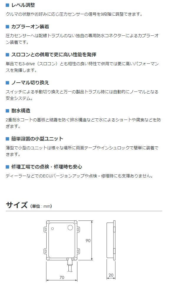 | ※本製品は、スズキ(K14C / R06Aターボ)エンジン用に最適なパワーアップをするために開発されたサブコンで、クルマの個体差やチューニング状態などに応じ変化率を9段階に調整できます。また耐水構造の小型ユニットは両面テープで装着でき、センサー部へもカプラーオンで簡単に装着可能です。 詳しくはメーカーサイトをご覧ください。 (※出品ページ記載の製品情報や適合情報は製品発売当時の情報となります。必ずメーカーホームページで最新情報をご確認の上ご注文ください。) | ||||