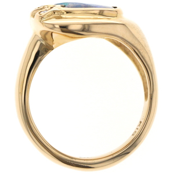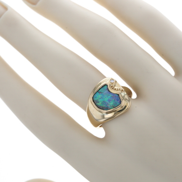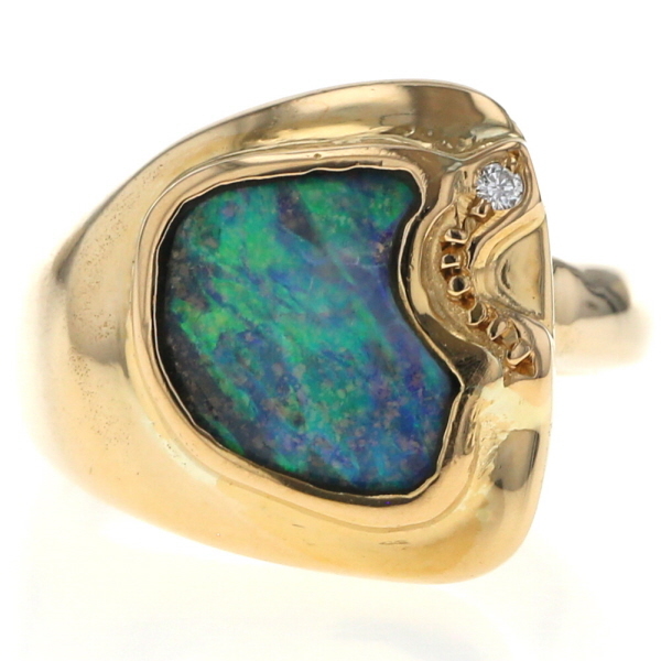 | 商品紹介 | 遊色が美しく浮かび上がるボルダーオパールをあしらったリングです。 天然の模様が際立つオパールを、イエローゴールドの柔らかな曲線が包み込み、アートのような存在感を放ちます。 そっと添えられた一粒のダイヤモンドが、全体に上質な輝きを添えるアクセントに。 個性とエレガンスを兼ね備えたデザインで、装いに静かな華やぎを添えてくれます。 |