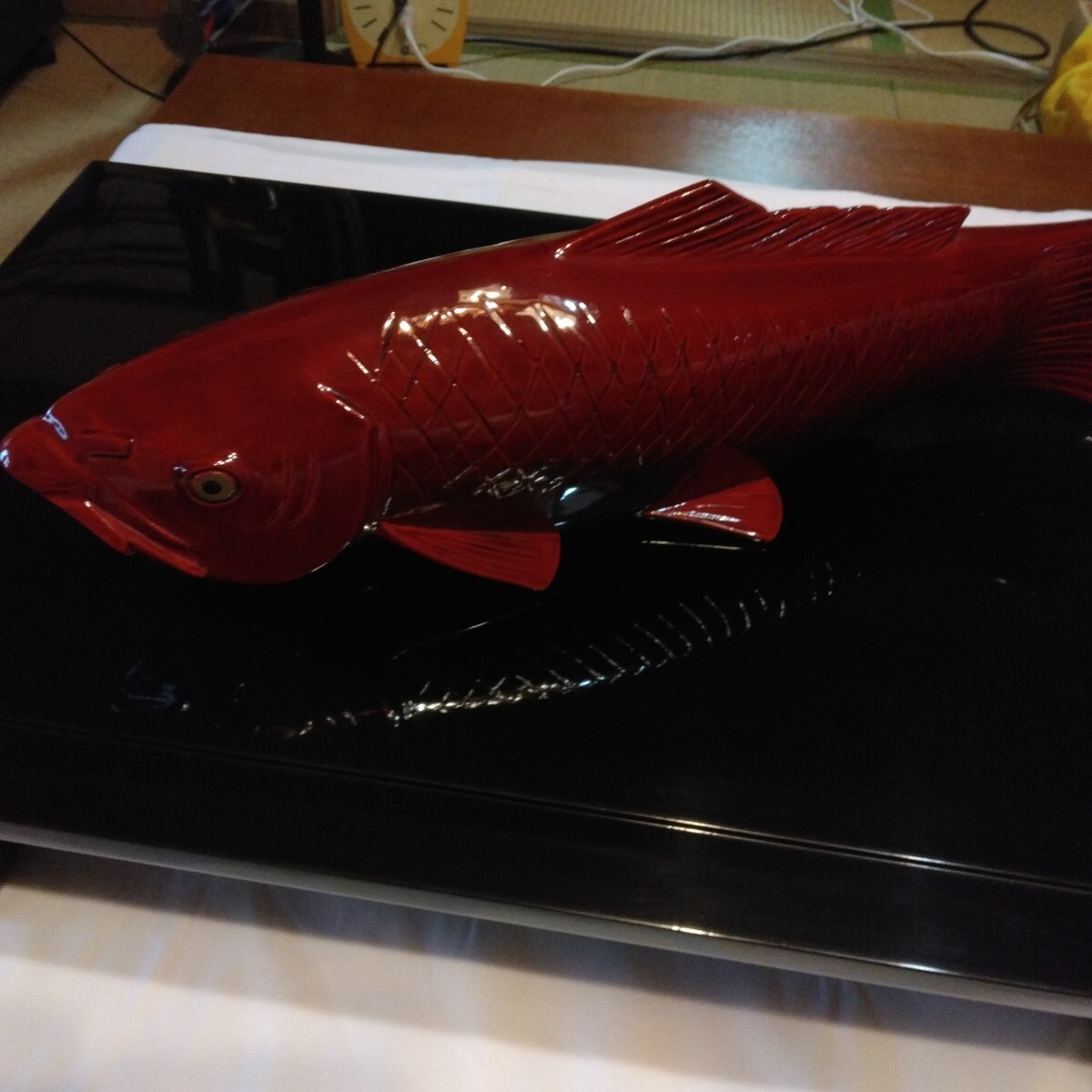 輪島塗、花台無地、魚置物、写真見て判断お願いします?一本木、彫刻家が掘らレ手、そこから、輪島塗、仕上げて有ります、何人の人に渡り仕上げて有ります。