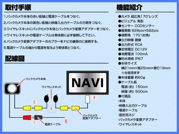 | ■CCDセンサー搭載 バックカメラとして評価の高いCCDセンサーを搭載しております。 また、広角カメラなので視認性も高く、より確実な確認が出来ます。 ■ワイヤレスキット付 映像信号を付属のワイヤレスキットで送受信させることが出来るため、煩わしい映像配線処理が比較的簡単に行なえます。 ■専用の接続アダプター付き 映像ケーブルの接続は、専用の映像変換アダプタが付属しますので、無加工で接続可能です。 ※注意事項※ メーカー純正品ではございませんので、純正品をお求めの方は購入しないで下さい。 |