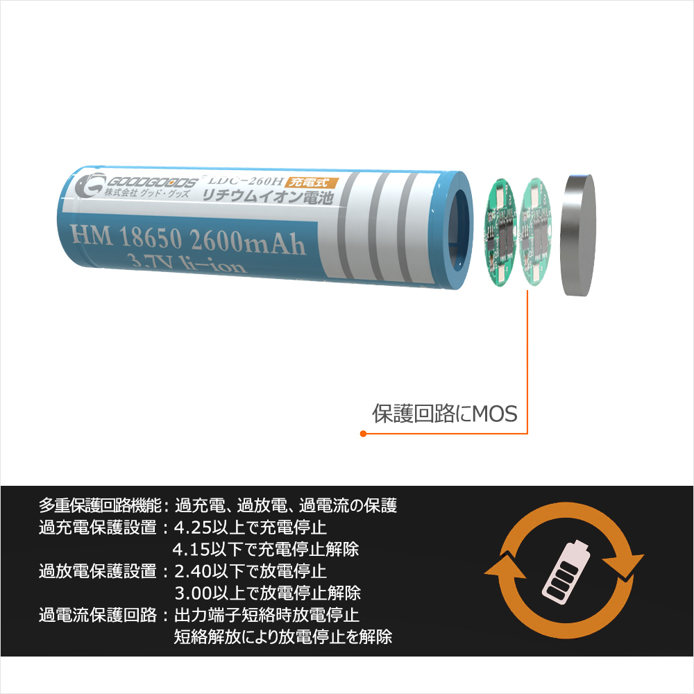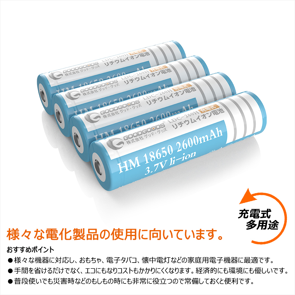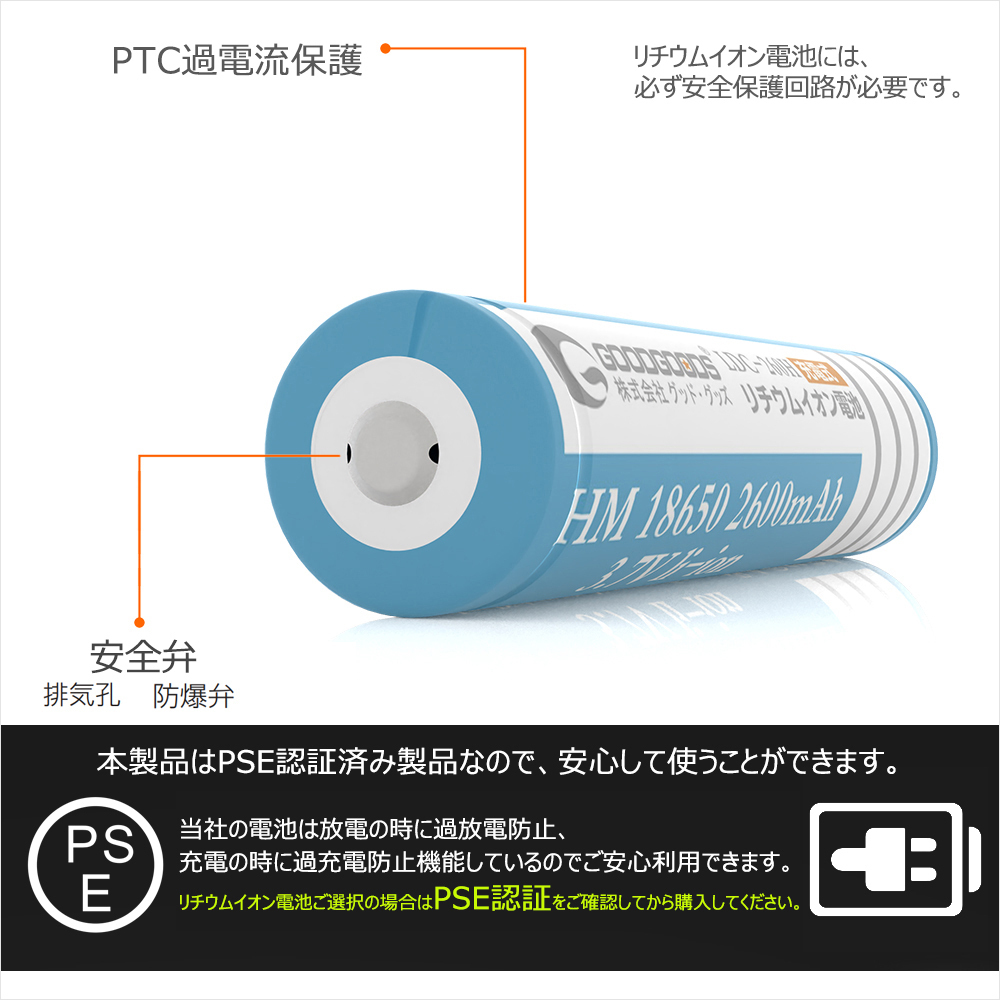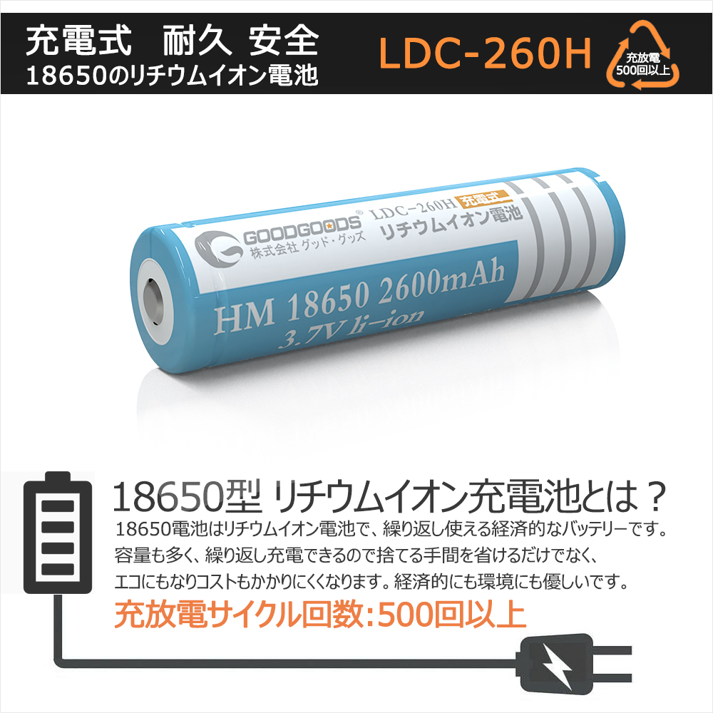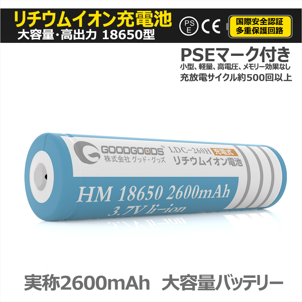 | ★オススメポイント★ ■安全性が高い 安全性を最優先に考え、設計・改良をし続けた18650規格の2600mAhリチウムイオン電池。 ■多重保護回路付き ・過充電保護機能:4.30±0.05V以上で充電停止 ・過放電保護機能:2.40V±0.1V以下で放電停止 ・過電流保護回路:出力端子短絡時放電停止 ■長寿命 充電可 18650リチウムイオン電池の使用寿命は長く、通常の使用で繰り返し充放電回数500回以上(充電して使い切ると、1回になります)。頻繁に充電が必要な商品におすすめです。 過充電・過放電防止の保護回路付きなので、電池の寿命を延ばすことができます。 ■非常時用としてストックするのもおすすめです。 18650電池などリチウムイオン電池は、放置している間でも放電しにくいので、ひと月に一回程度、充電しながら非常時に備えるといいでしょう。 釣り、キャンプ、登山やハイキングなどのアウトドアに。また、災害時の照明など非常用電源としても頼れる充電池です。 ■メモリーエフェクトなし メモリーエフェクトないので、耐久性と長い寿命があります。 ■PSE安全認証済 |