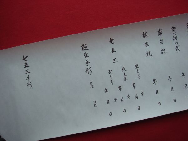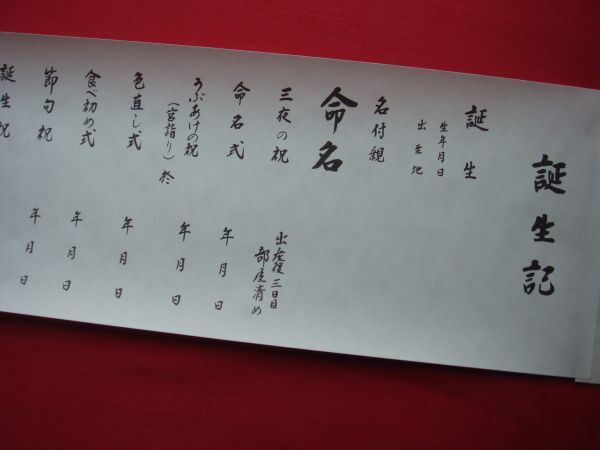 “ 誕 生 記 ” 可愛いお子様のご出生から ご成長へのお祝い催事をご筆書なされて、 ご誕生由緒の大切な記録として末永くご保存下さい。 三夜の祝、命名式、宮詣り、食べ初め式、節句祝い、 七五三、手形等々、節目の折にご記録下さいませ。 【サイズ】