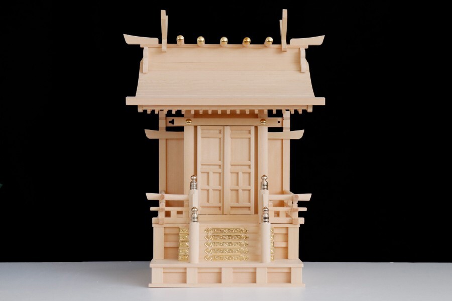 お支払方法に代引きはお選びいただけません。 培われた木工技術をふんだんに盛り込んだ、「匠造り」シリーズの神棚。職人の技を集約した、工房手作りの逸品。 木曽桧材の美しい木肌と繊細な組み上げにより、とても上品で高貴な雰囲気です。 「尾州桧」「官材」等とも呼ばれる希少な木曽ひのき材は、神棚用としては最高級品のみに使用されます。 ■■雄大な流れ屋根 極み 八幡宮■■ 上品な木肌と真鍮金具の落ち着いた輝きが高級神棚ならではの趣を演出しています。柾目と板目を使い分けた、職人の技と心意気をも感じる事の出来る工芸品。 手の込んだ「流造(ながれづくり)」の屋根は、「伏見稲荷大社」や「下鴨・上賀茂神社」など多くの神社建築で使われる、伝統的なお社の形です。神棚を一段と優雅に見せる「切り抜き加工」や「煌びやかな金具」のこだわりの技術は、本格的な極上神棚をお探しの方に是非お勧めです。 お神札の納め方は扉部分を外し正面から納める構造となっており、大きなお神札や木のお神札にも対応いたします。 神具セットも厳選。木曽ひのき彫り込み神鏡2寸、木曽ひのき長膳、国産せともの神具陶器7点、造花榊が付属いたします。 | ||||
