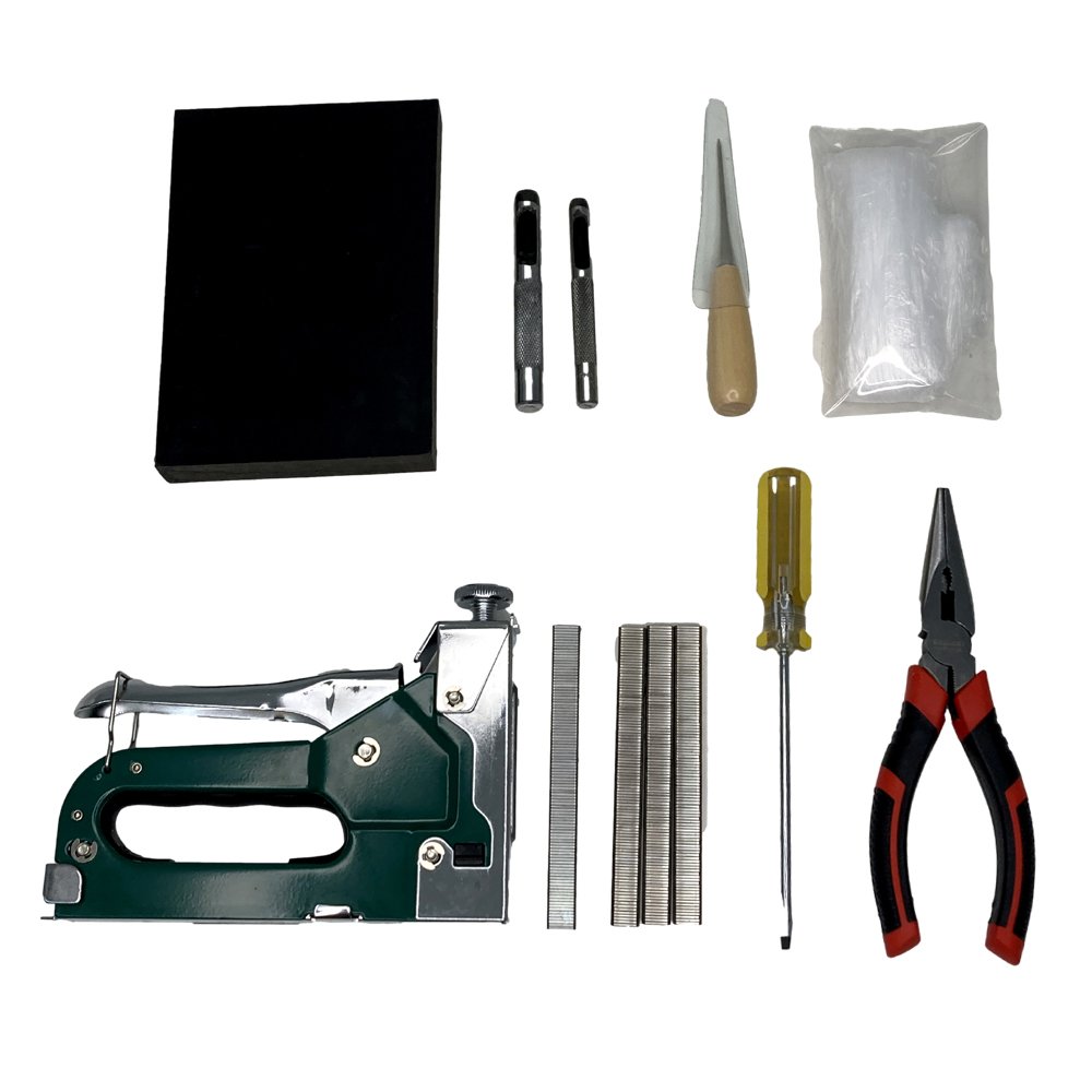 | (1)Z900RS専用 張替シート (2)ツートンタンデムベルト (3)タンデムベルト金具/ボルト(ステンレス製)2セット (4)防水用ビニールシート (5)ポンチ台 (6)タッカー本体 (7)目打ち (8)マイナスドライバー (9)タッカーの芯(8mm) (10)タッカーの芯(6mmx2本) (11)穴あけポンチ(8mm) (12)穴あけポンチ(6mm) (13)ラジオペンチ | ||