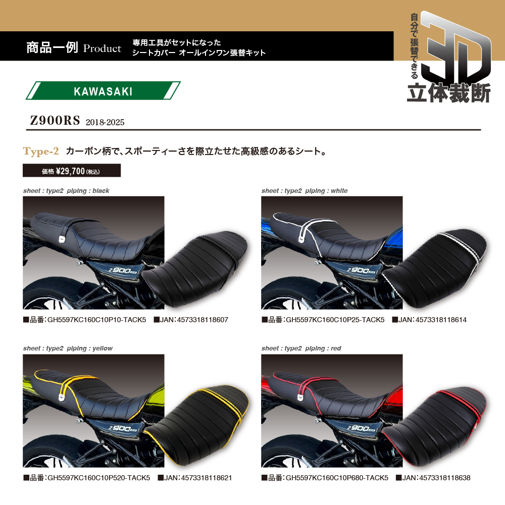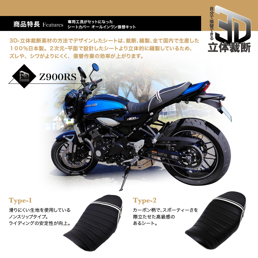 | 【日本製】Z900RS シート張り替えキット ─ 必要な工具完備&カーボン柄でスポーティーに!! こちらの商品はシート表皮に+張替に必要な工具が全てセットになったDIY張替キットになります。 シート表皮にはカーボン柄を採用。スポーティな印象とスタイリッシュさをさらに引き立て走行時の存在感をアップさせます。 3D-立体裁断素材の方法でデザインしたシートは、裁断、縫製、全て国内で生産した100%日本製。 2次元ー平面で設計したシートより立体的に縫製しているため、ズレや、シワがよりにくく、張替作業の効率が上がります。 生地は、厚手の合皮を使用し強度のある生地を採用、丈夫で破れにくい合皮素材になります。(難燃試験FMVSS難燃試験合格品) 座面は高周波ウエルダー処理により5CM間隔でのタックロール仕様、座面の縫目には補強の役目を果たすパイピングが入っていますので耐久性も向上します。 専用工具と詳細な説明書も同梱されており、手順に従って簡単に作業が完了、初心者の方でも安心して作業できます。 | ||