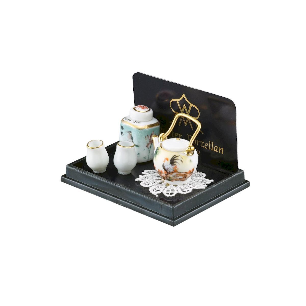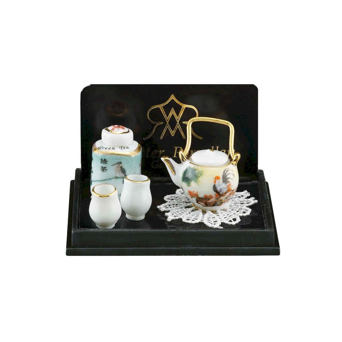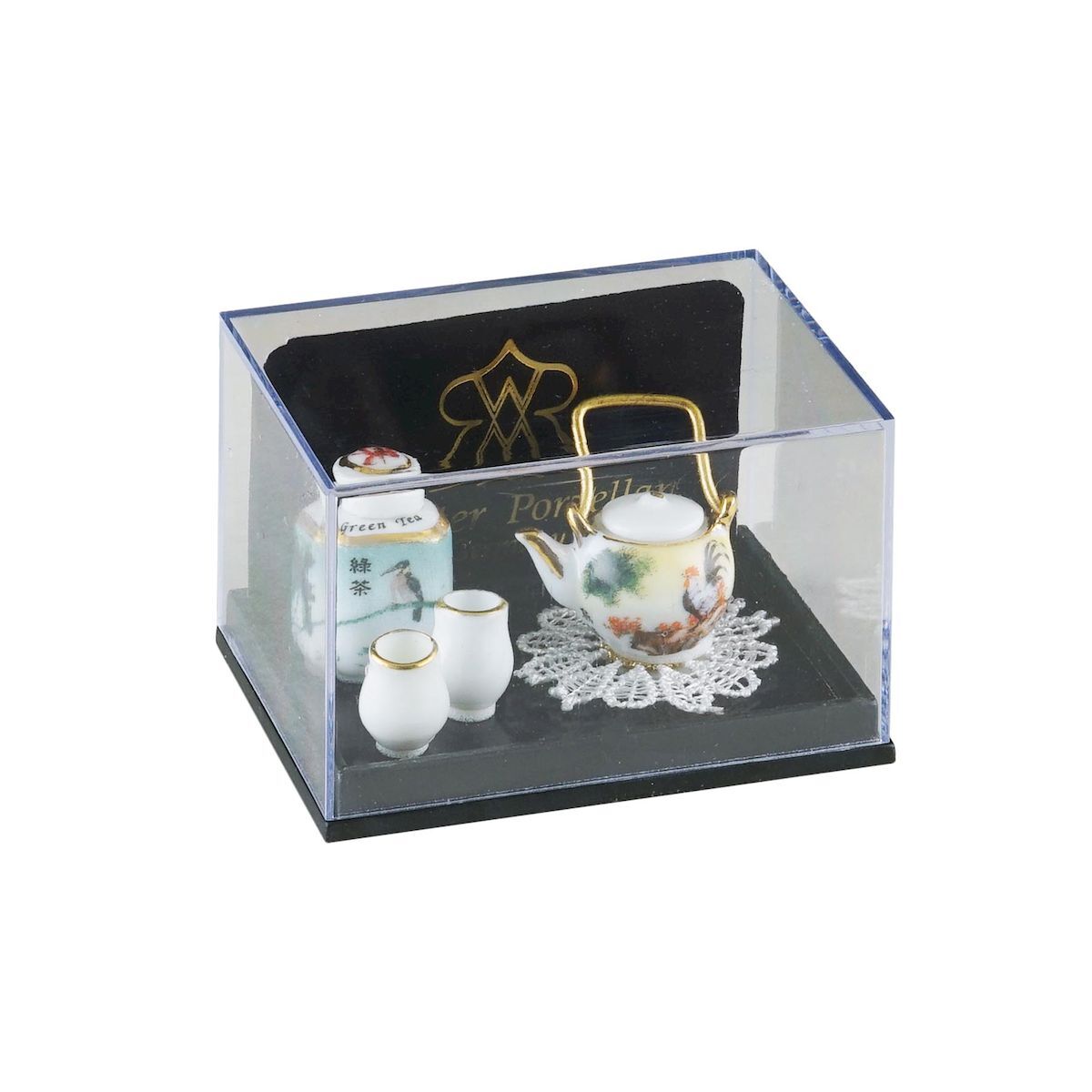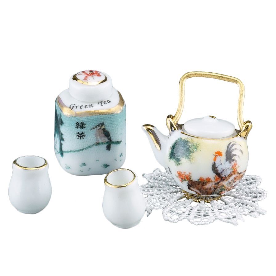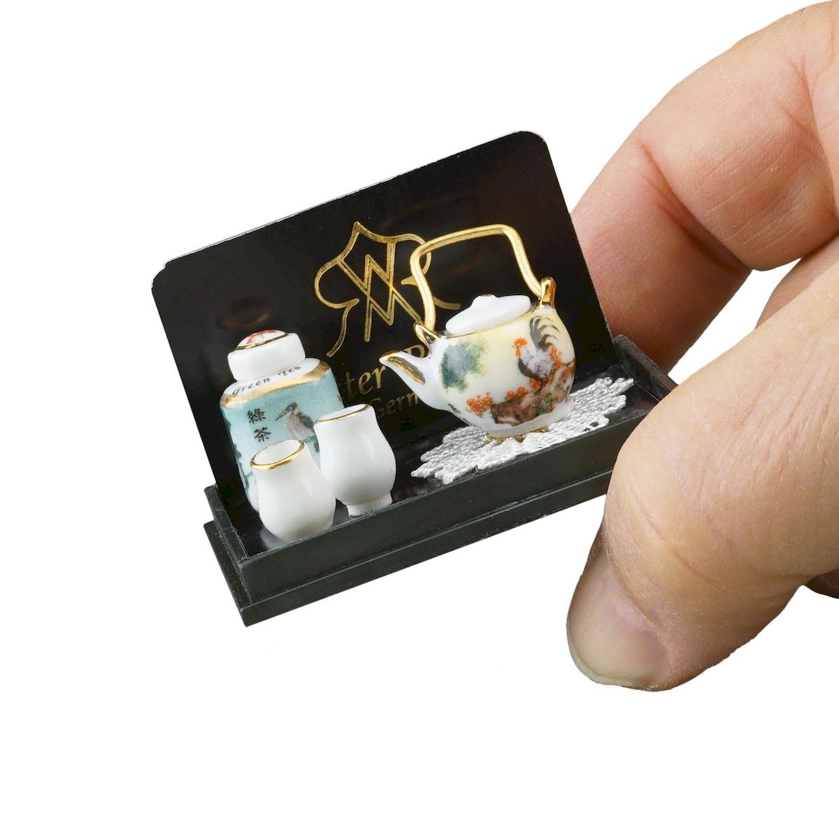 ドイツロイター社製のミニチュアです。日本茶セットと言いつつ、柄はどう見ても中国っぽいですよね…。まあ、ヨーロッパから見たアジアンテイストという事で、勘弁してあげてください!これはこれで、素敵なセットです。※ティーポットと茶葉入れのフタは接着されています。アクリルケース入りです。アクリルケースからは取り出せます。アクリルケースのサイズ:W55xD42xH35。湯呑のサイズ:直径8ミリ、高さ10ミリ。茶葉入れのサイズ:13x13xH15ミリ