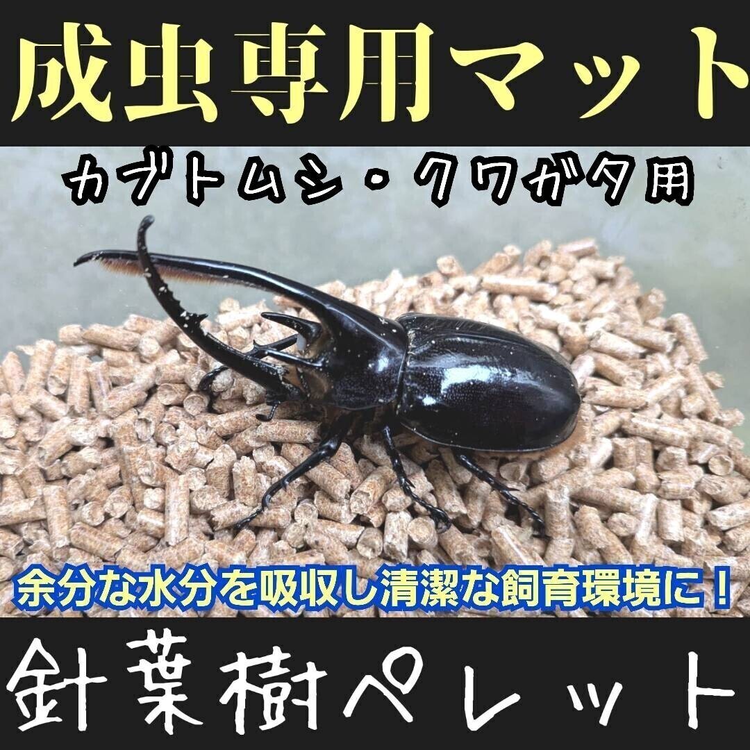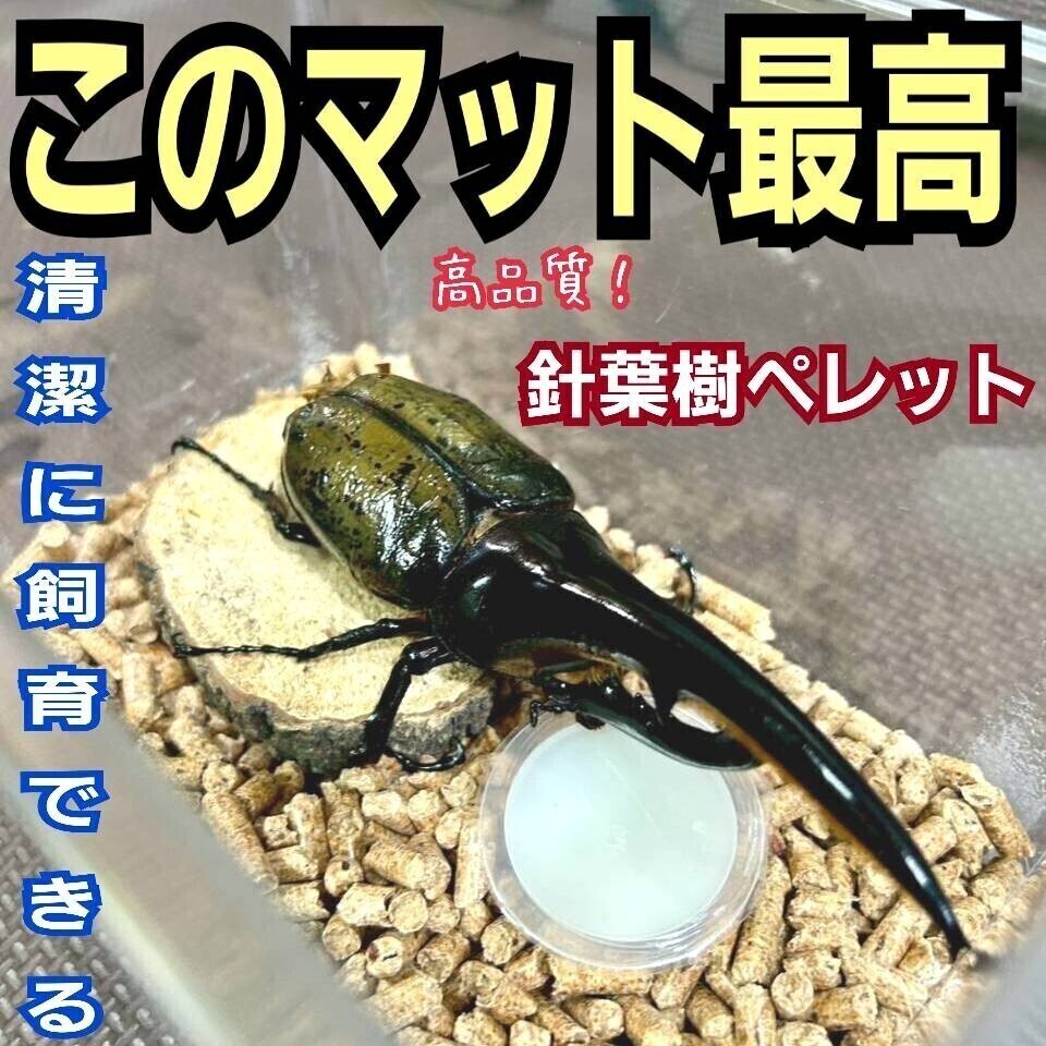 無農薬の国産針葉樹のみを粉砕してあるのでカブトムシ、クワガタ には無害で安心してご使用できます。 針葉樹の持つ防虫、抗菌、消臭効果抜群です。 成虫管理には是非お勧めです。 見た目もきれいで衛生的にクワガタ、カブトムシの成虫管理ができます。 「フィトンチッド」などの天然成分が、雑菌の繁殖やカビの発生を抑える効果があります。 弱殺菌処理でクワガタ、カブトムシに有害な成分を除去までしてくれるのです。 木の自然な香りがあり、部屋の中でも使いやすいです。 消臭効果もあり清潔な環境を保ちます。 ペレット状なので保管や交換が簡単。崩すとおがくず状になります。 また、ペレットは余分な水分を吸収してくれます。 水分を吸収すると画像のようにマットがパウター状になり3倍の容量に増えます。