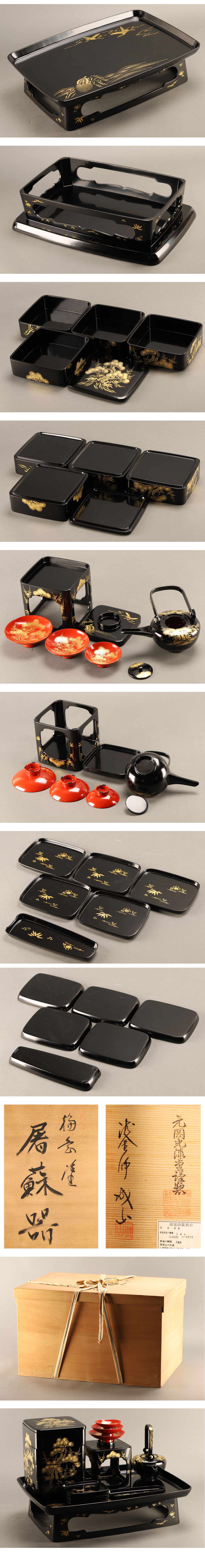 盆 幅 約54.6×38cm 高 約13.5cm 重箱 幅 約18.3×18.3cm 高 約24cm 銚子 幅 約20.5×12.7cm 高 約20cm 盃 大 幅 約12.6×12.6cm 高 約4.5cm 盃 小 幅 約9.1×9.1cm 高 約3.5cm 盃台 幅 約15×15cm 高 約15.8cm 銘々皿 幅 約14×11.3cm 高 約1.4cm 箸置き 幅 約20×6.8cm 高 約1.8cm |