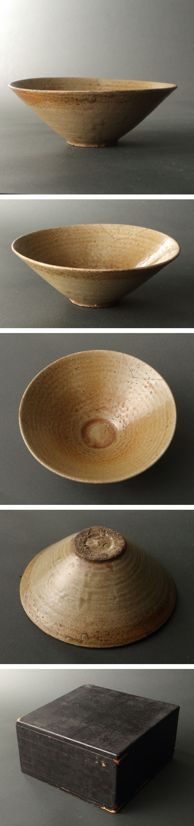 11世紀の青磁碗です。 立ち上がりは斗笠盞風、璧底(玉璧底)とも呼ばれる璧状の蛇の目高台を有し、陸羽の『茶経』で激賞された唐代越州窯の青磁碗を彷彿とさせる一碗です。内刻の大きさから「末期蛇の目高台」に分類され、全羅南道康津系の土築窯で生産されたものとみられます。 焼成も米色に仕上がっており、高麗の喫茶文化の中でも特に珍重されたものと推察されます。伝世の見事な逸品です。 寸法:高さ6cm、幅16cm(最大幅。若干の誤差はご了承下さい) 状態:経年感、トリアシ、直しがございます。 |