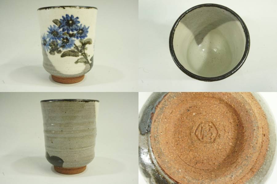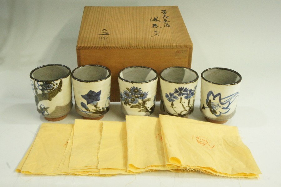 ●京焼 六兵衛窯 清水六兵衛 草花画変湯のみ五客揃 窯もの 工房作品 セット 湯のみ 煎茶碗 共箱 共布 未使用 茶道具