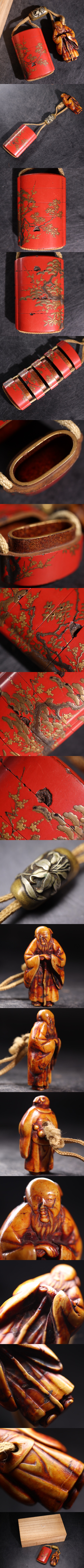 | 時代 金蒔絵 印籠 骨 寿老人 根付 木箱付 / 漆芸 漆器 提げ物 細工物 .G3085 |