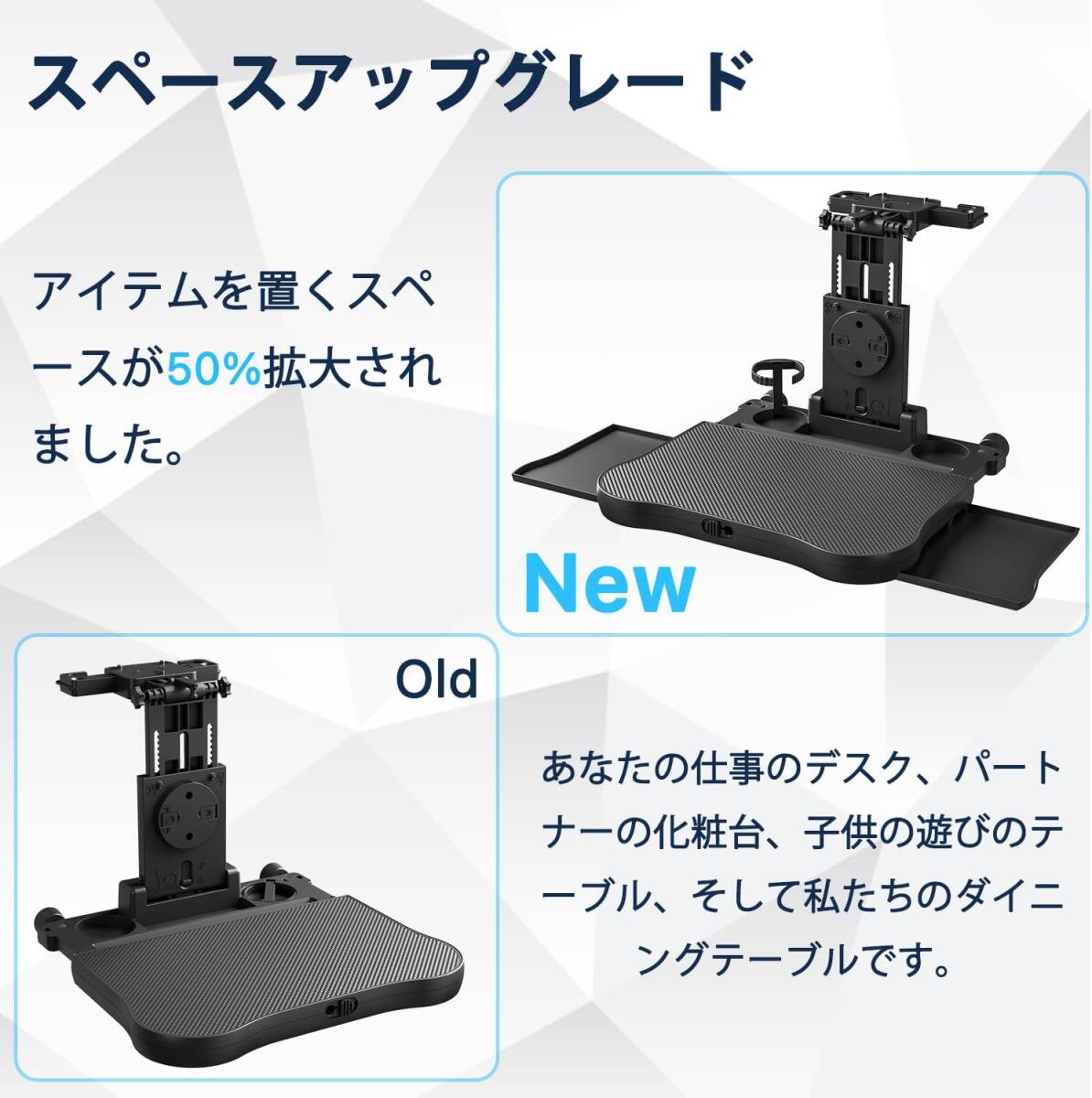 | 【多機能カーテーブル】 車 テーブル、カップホルダー2個、そして360°回転する携帯電話ホルダーが付いています。スマホホルダーは最大9cmまで伸ばすことができ、市販されているほとんどのスマホに対応しています。回転角度も360°なので、動画を自由な角度から見ることができます。また、テーブルは上下に調整可能で、子供から大人まで使用できます。車内で仕事や食事、読書、飲み物を置くのに便利です。あなたと同乗者を楽しませてくれます。 【耐荷重15kg】後部座席に設置できるカーテーブルは、高品質のABS素材を使用しており、耐久性があり、安定した頑丈なつくりで、約15kgの荷物も安心して置けます。また、お手入れも簡単です。贈り物にも最適です! 【省スペース】折りたたみ式のカーテーブルは、分解する必要がなく、車内で場所を取らず、厚さも約4cmしかありません。片付ける手間が省けます。15.6インチまでのノートパソコンも収納できます。また、カップホルダーは底面直径7cmまでのドリンクボトルに対応しています。 【安定性が良く、安心して使える】三角形の支柱で倒れにくく、回転する2本の支持脚でより安定したカーテーブルを提供します。また、滑り止めのゴム製マットが付属しており、物が滑らないように保護します。このマットはテーブルに接着されていないため、簡単に取り外して掃除や水洗いができます。さらに、ダブルサイドのステッカーを使用して、マットをテーブルの表面に貼り付けることもできます(パッケージに同梱されています)。テーブルを使用しないときには、マットは収納に便利です。 【クイックインストール】工具不要で簡単に取り付けができます。フロントシートの背もたれに装着し、高さ調整も可能です。注意:ヘッドレストバーがある場合にのみご使用いただけます。適用範囲は車のシートレバーのピッチが9~22cmの場合に対応しています(購入前に車のヘッドレストレバーのピッチを測定してください)。L140 |