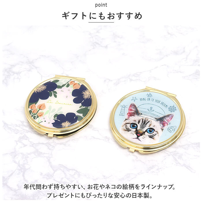 | 商品説明 | ・・お出かけのお供にぴったり。「ルソイーユ拡大鏡付き両面コンパクトミラー」が新登場。 ・【大人可愛いデザイン】 ・表面のこんもりとした透明樹脂盛りがポイント♪ゴールドカラーを取り入れ、可愛らしくも上品な印象を演出。外出先でも使いやすいミラー。 ・【使い勝手の良い両面タイプ】 ・開くと内側が2面仕様。片面が約2倍の拡大鏡になっており、お好みに合わせて使い分けOK。 ・【持ち運びがスマート】 ・ミニバッグやポーチにそっと忍ばせておけるサイズ感。スリムなフォルムで、かさばることなく持ち歩けるのが嬉しい! ・【ギフトにもおすすめ】 ・年代問わず持ちやすい、お花やネコの絵柄をラインナップ。プレゼントにもぴったりな安心の日本製。 |
