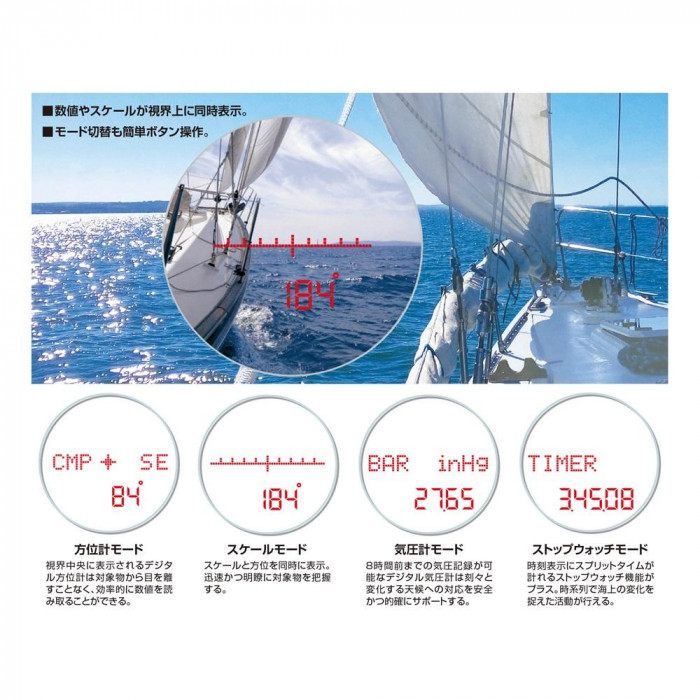 | 7倍望遠、50mmレンズ径は最適な明るさと視界を獲得し、天候や揺れなど厳しい状況下でも左右されない完全防水・曇り止め設計、滑り防止&衝撃吸収ラバーグリップを備える。暗がりでも見やすい赤色表示の数値やスケールは視界上に同時表示され、効率的に視認できます。 |