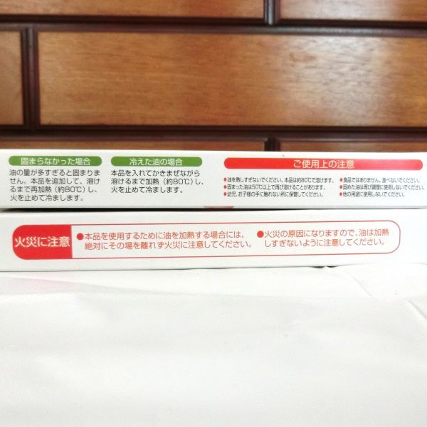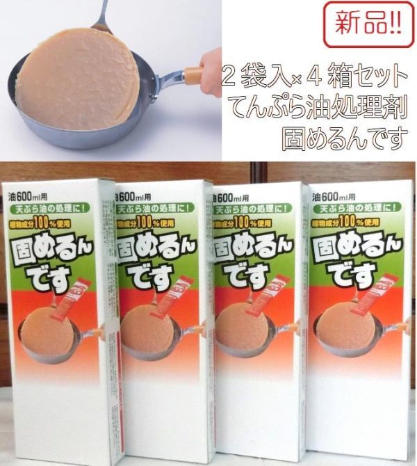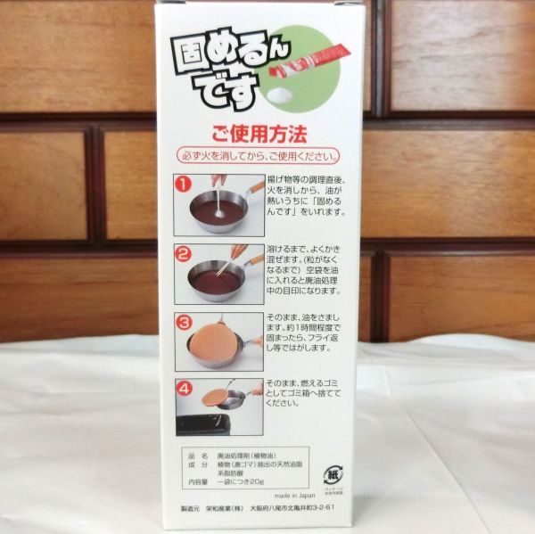 ☆★送料無料!!★☆未開封新品です!☆★ てんぷら油の処理剤を4個セットでお譲りいたします。600mlの油に使用する用の20g入りの袋が1箱に2本入っておりますので、合計8袋、8回分入っています。 油をしっかり固めて、めんどうな液体ゴミを手や台所を汚さずに簡単に処理できます。 植物成分100%を原料としていますので、安心してお使いいただけます。 揚げカスもそのまま一緒に固めるので、鍋、フライパン等の手入れも簡単にすみます。 まだいくつか在庫ございますので、複数個ご入用の方はコメントにてお気軽にお申し付けください。送料が浮けばその分お安くできます! 注意!外箱に傷やテープが付着している場合があります。中身に影響ありませんが、過度に気にされる方は購入をお控えください。 ------------- 【メーカー】:栄和産業 【個数】:4箱 【内容量】:それぞれ20g入りが2袋 【成分】:植物(唐ゴマ)抽出の天然油脂系脂肪酸 【使用上の注意】: 本品は約80度で溶けます。 固まった油は50度以上で再び溶けることがあります。 幼児、お子様の手に触れない所に保管してください。 食品ではありません。食べないでください。 固めた油は再び調理に使用しないでください。また、他の用途に使用しないでください。 必ず火を消してから、ご使用ください。 【配送方法】:ネコポス ※厚さ制限の為、箱ごと封筒に入れるだけのごく簡単な包装のみでの梱包になります。過度に気にされる方は購入をお控えください。
