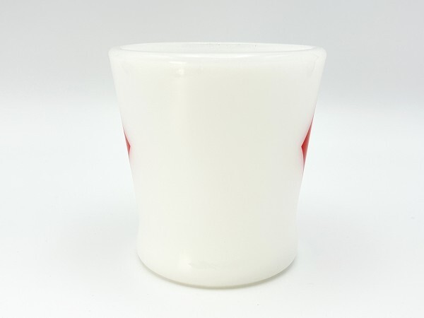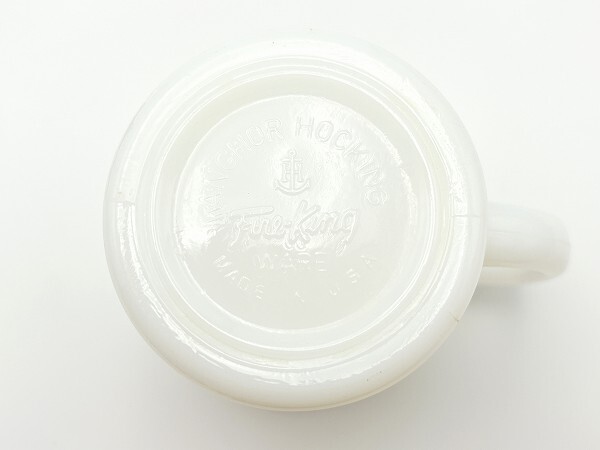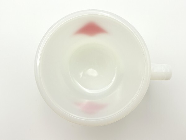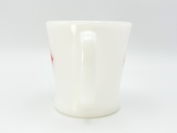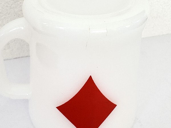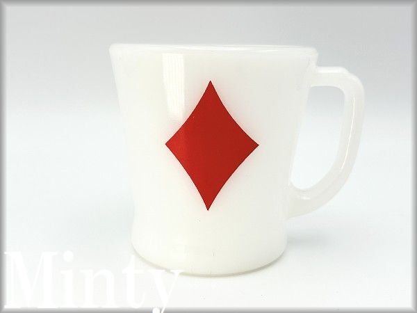 ■商品説明:ファイヤーキング・トランプ カード ダイヤモンド・マグです。 人気のトランプシリーズ柄。シンプルでレトロ感のあるマグ。 ハート、ダイヤ、クローバー、スペードの全4種がそろいます。 こちらは人気のダイヤ。 ■コンディション:★★★★☆【エクセレント~ニアミント】 割れ、欠け等ありません。 使用感がなく、目立った痛みもありません。 全体的に良いツヤがある美品です。 内側も外側もツルツルで、非常に良いツヤがあります♪♪♪ 7枚目の写真にあるように底部に1センチ、7ミリほどの縦のラインがありますが、爪で触れるとわずかに引っかかる程度で、水漏れや内部への貫通はありません。経年によるクラックまたは製造時よりのラインと思われます。使用には問題ありませんが、状態をご理解のうえご検討ください。 ■サイズ:横幅10.5cm、直径8.2m、高さ8.5cm ■刻印:ANCHOR HOCKING イカリ Fire-King WARE MADE IN U.S.A |