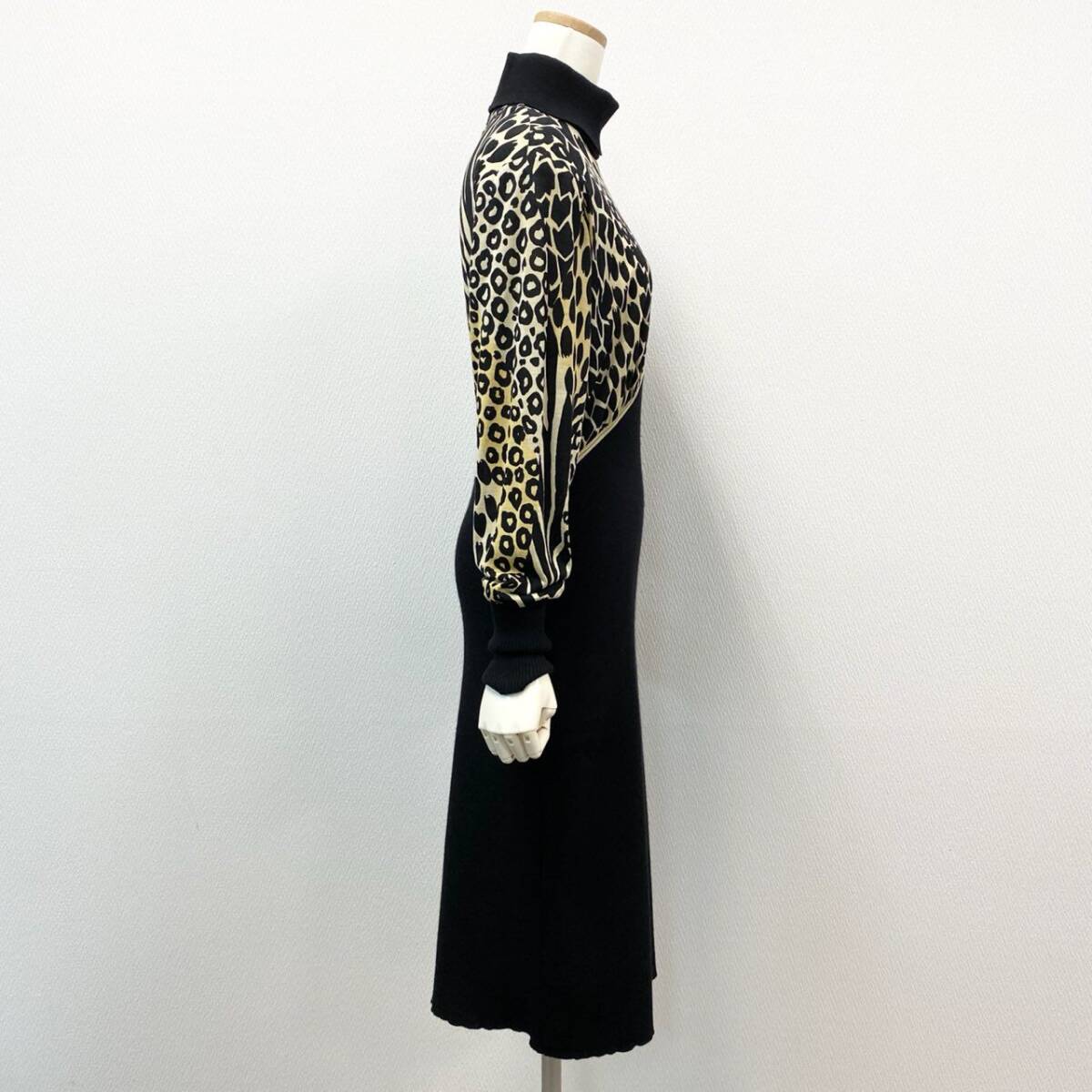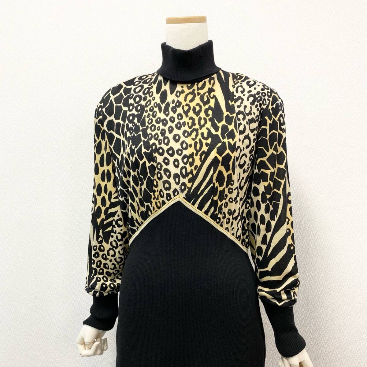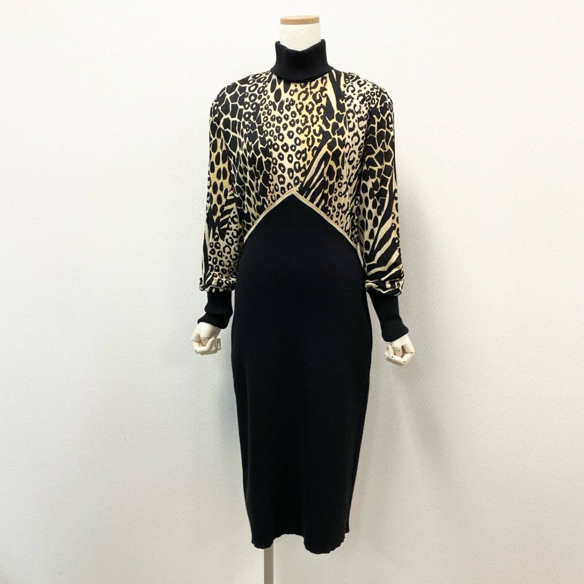 | スタッフ商品コメント | ブラックをベースに、ベージュ〜ゴールド系のアニマル柄を大胆に配したLEONARDのニットワンピース。異素材のコントラストが高級感を演出します。ハイネックとドルマンスリーブがモードな印象を与えつつ、ボディラインを美しく引き立てるデザイン。ディナーシーンやパーティーなど、華やかな場にふさわしい一着です。 |