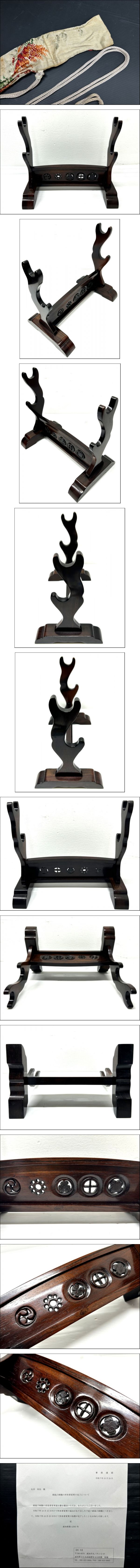 | 商品説明 | COWCOW堂 市場へようこそ! 多種多様な商品を取り揃えておりますので、 他の商品もご覧ください! また、買取にも力を入れておりますので、 ご不要な物がございましたら、是非ご連絡ください。 詳しくはHPをご覧くださいね! 因みに新ID取得のため 評価はありませんがビギナーではございません。 ご安心ください。 それでは宜しくお願いします。 ◆商品詳細 ・貴重刀劔認定書付き 越前下坂 無銘 短刀 ・特別貴重小道具認定書付き 合口拵 鞘 藤巻 總金具 角製 ・高級欅 刀二本掛台 カラー:画像でご確認ください。 越前下坂 短刀 貴重刀劔認定書の内容 ・短刀 無銘 (越前下坂) ・尺 八寸四分 ・昭和45年5月9日 実寸 (素人採寸になりますので、多少の誤差はご理解ください) ・収納時:39.8cm ・刀全体:37.0cm ・刃:24.8cm ・質量:379g (ケース含む) 特別貴重小道具認定書付き 合口拵 ・鞘 藤巻 總金具 角製 ・昭和45年5月9日 実寸 (素人採寸になりますので、多少の誤差はご理解ください) ・収納時:38.0cm ・刀全体:35.3cm ・刃:25.5cm ・質量:136g (ケース含む) 刀二本掛台 ・最大値:130.4×17.9cm 高さ25.5cm ・質量:803g (素人採寸になりますので、多少の誤差はご理解ください) 銃砲刀剣類登録証の内容 ・登録記号番号:高知 第 壱弐五六参 号 ・種別:短刀 ・長さ:弐五.六センチメートル ・反り:0.参センチメートル ・目くぎ穴:壱個 ・銘文:表 無銘 ・高知県教育委員会 昭和39年11月7日 ≪必ず下記に目を通してください≫ こちらのお品物は 前所有者様名義から 一旦、私が譲渡しましたので所有者変更を 行っております 所有者変更も完了しております 画像でご確認ください 高知県 文化生活部 歴史文化財課に 所有者変更届出書の用紙を余分にいただきましたので すぐに変更できるように届出書の用紙と 私が申請した時のコピーがありますので サンプルとしてお付けいたします 銃砲刀剣類登録証のコピーもお付けいたしますので 届出書と登録証を同封し 110円分の切手を貼って 下記の住所に送ってください ↓ ↓ 〒780-8570 高知県高知市丸ノ内1丁目2番20号(本庁舎5階) 宛名 高橋 記念物・埋蔵文化財担当 088-823-9052 必ずお品物が届いてから20日以内に 所有者変更届出の申請を行ってください だいたい1週間くらいで受理されるそうです ※提出された所有者変更届出書に問題がなければ、 ご連絡・受理通知は差し上げておりません。 受理通知が必要な場合は、届出書提出時に、 切手を貼った返信用封筒を同封してください 詳しくは こちらの→高知県歴史文化財課HPをご覧ください。 お屋敷からの引上げ物になります 他にもいろいろと出品していきますので 興味のある方はご覧ください *詳細は画像でご確認/ご判断ください。 ≪商品の状態≫ ・大変古いお品物だそうです 長期保管品になります ・短刀も合口拵も 大事に保管されていたようで大変キレイな状態だと思います 腐食やサビ、刃こぼれ等はありません ですが、大変古い物になりますので 経年劣化による品質劣化は少なからずあるとは思います 画像でご確認ください ・他の不具合等はわかりませんので、画像でご判断下さい。 ・デリケートなお品物ですので 一切クリーニングは行っておりません ◆当方は専門知識が無い為、 記載以外の破損・改造・欠品等が有る場合もございます。 画像を入念にご覧になり入札のご判断下さい。 ◆画像のものが全てとなります。 ◆神経質なお客様・細かな事を気にされる方 新品の様な使い心地を期待される方はご入札をお控え下さい。 ◆現状売切り中古品という事をご理解頂き、 ご納得の上、入札をお願い致します。 |