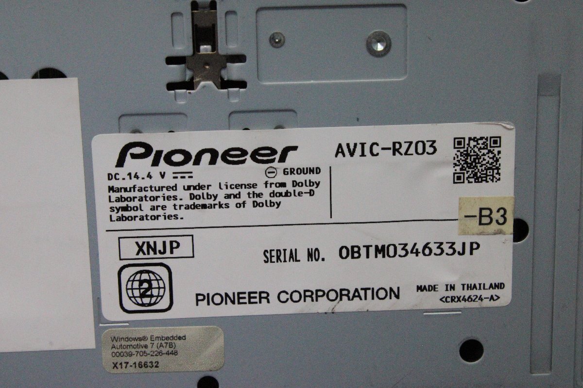 | メーカー カロッツェリア 形式 AVIC-RZ03 シリアルNo OBTM034633JP 地図データー 2014年 付属品 電源配線・GPSアンテナ・TVアンテナ(フィルム欠品) |