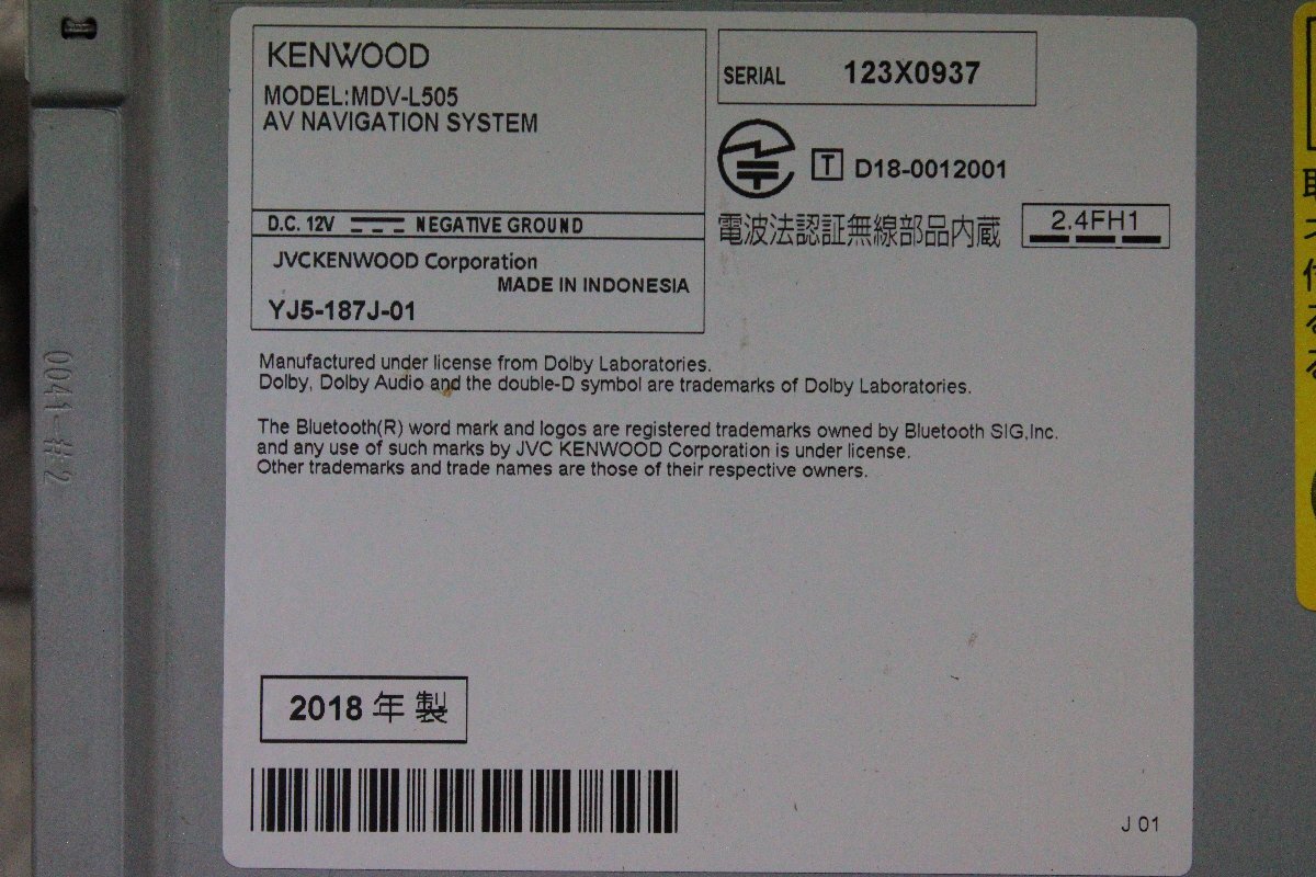 | メーカー ケンウッド 形式 MDV-L505 シリアルNo 123X0937 地図データー 2017年 付属品 電源配線・GPSアンテナ・TVアンテナ(フィルム欠品) |