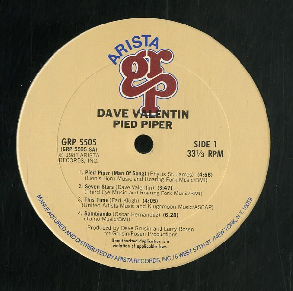 A00574748/LP/デイヴ・バレンティン(DAVE VALENTIN)「Pied Piper (1981年・GRP-5505・ラテンジャズ・ジャズファンク)」