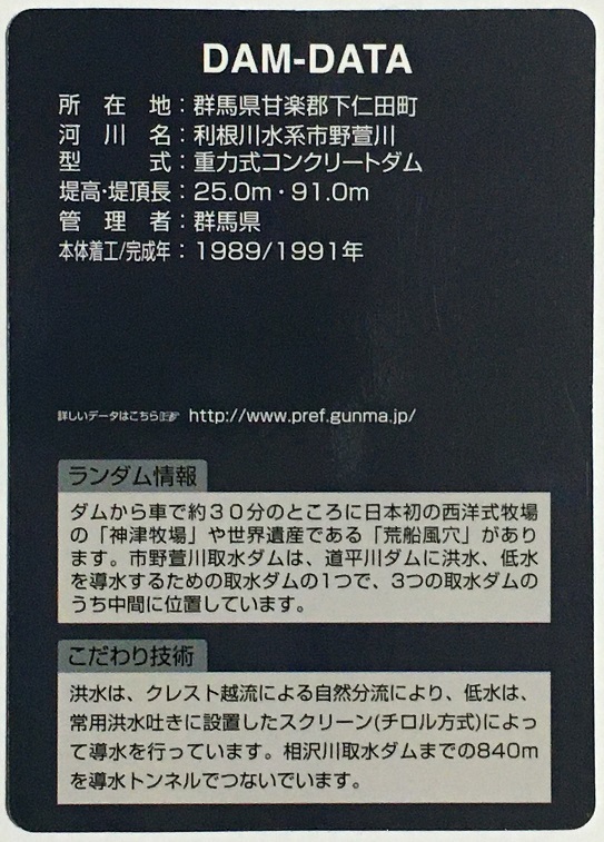 | ダムカード 群馬県 市野萱川取水ダム Ver.2.0 | |