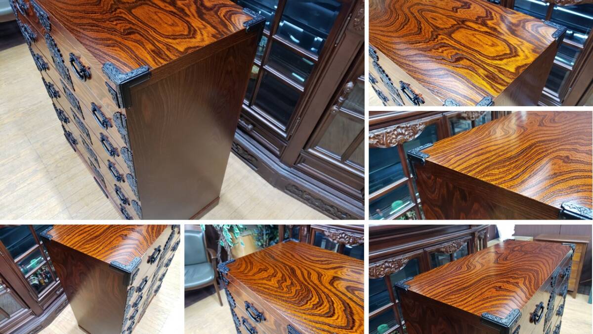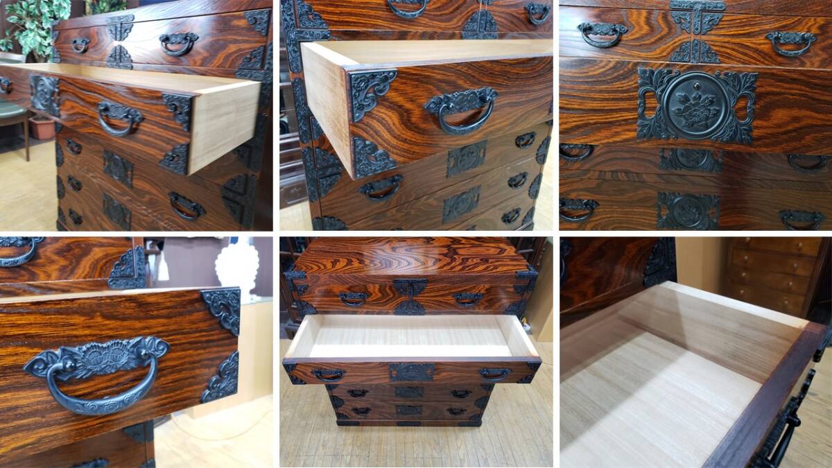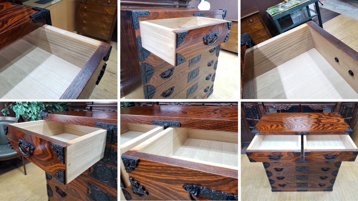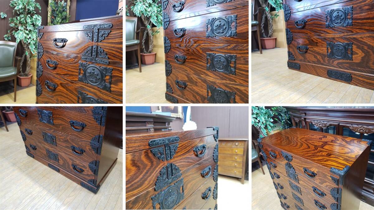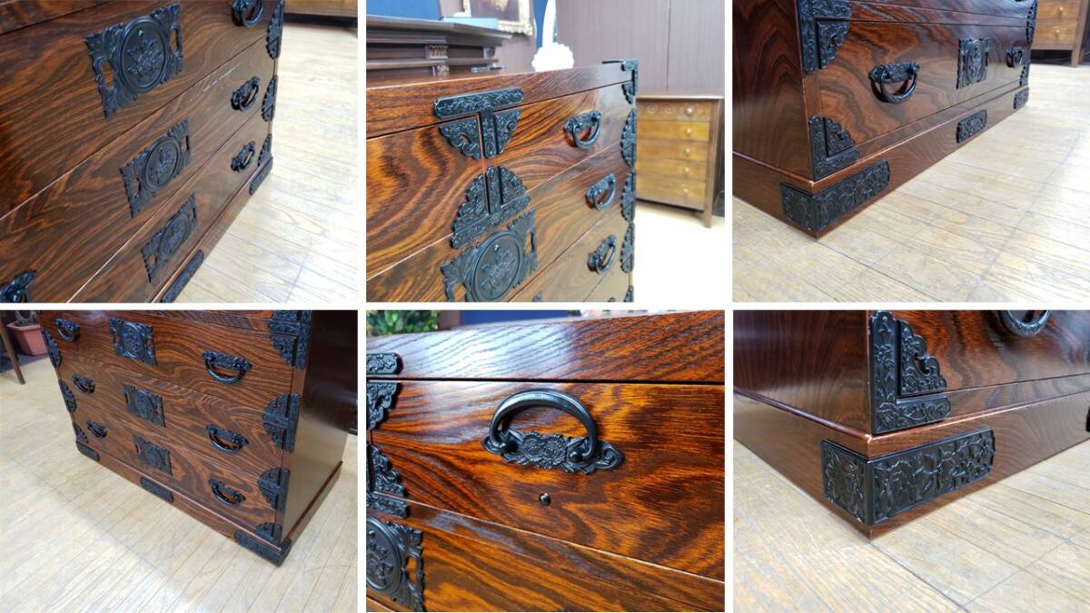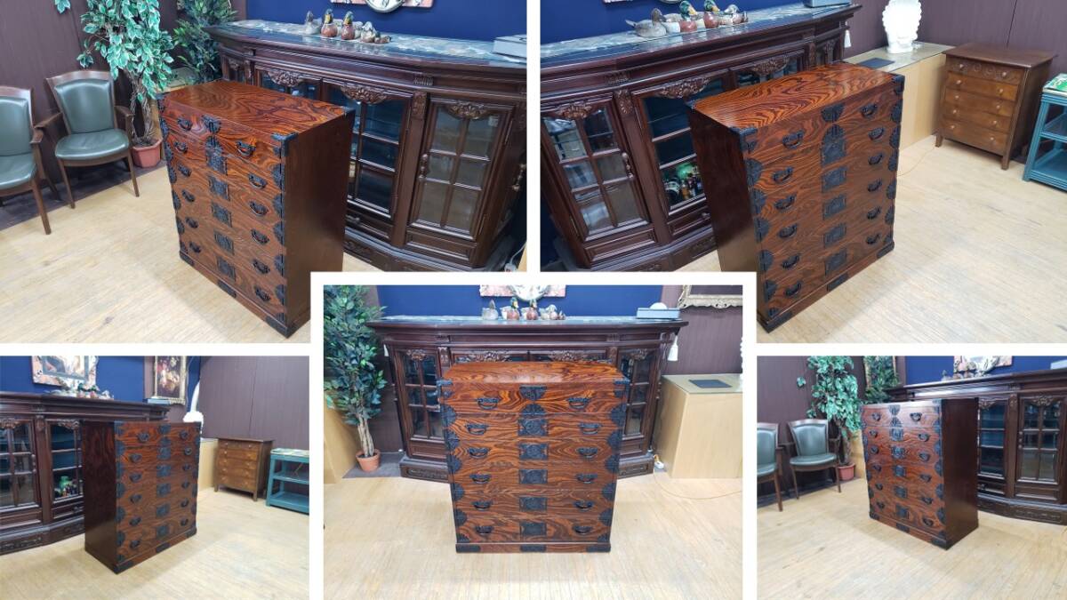 個人的な知り合いの資産家から譲り受けた品物です。商品を見て金具、造りを鑑みて当方は岩谷堂家具だと考えております。しかしながら残念な事に焼き印等は見当たりません。因みに岩谷堂家具であっても焼き印等が無い場合もありますので或いはタグが取れてしまったかもしれません。全体的に特記すべき欠点等は無く大切に使われていた事が伺えます。機能的にも問題ありません。写真をよくご覧になって判断をお願い致します。USEDとなります。画像をご覧になる環境により実際の色と若干の違いがあるかも知れませんがご了承下さい。【サイズ】幅85.5㎝×奥行43㎝×高さ100㎝