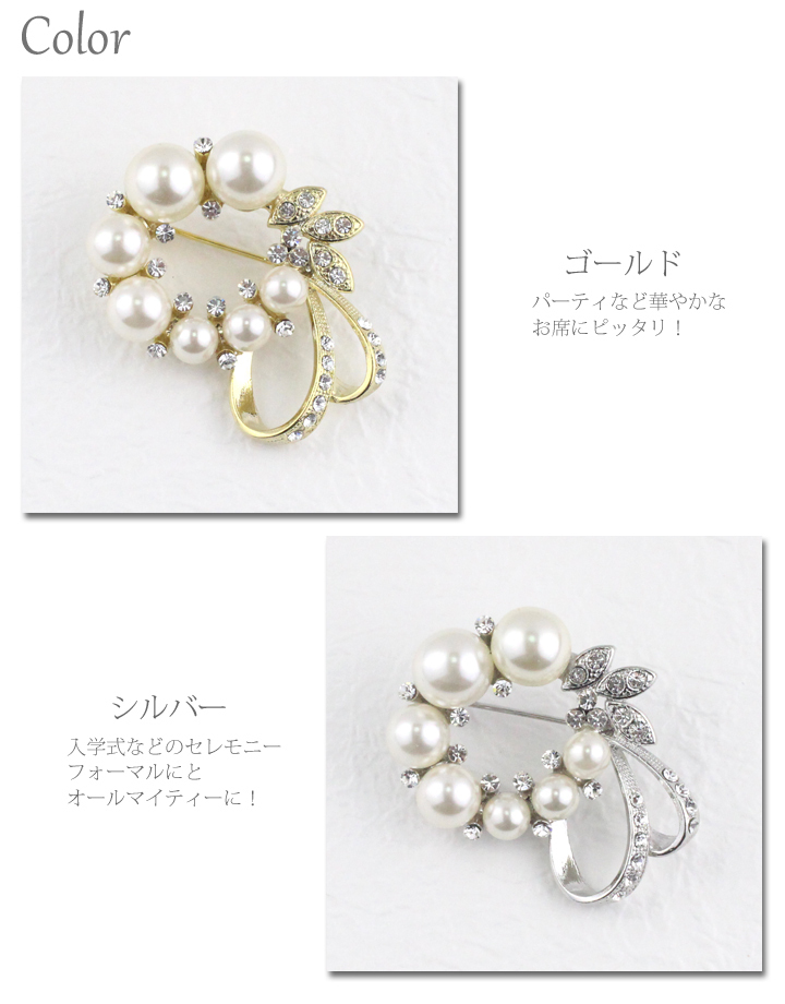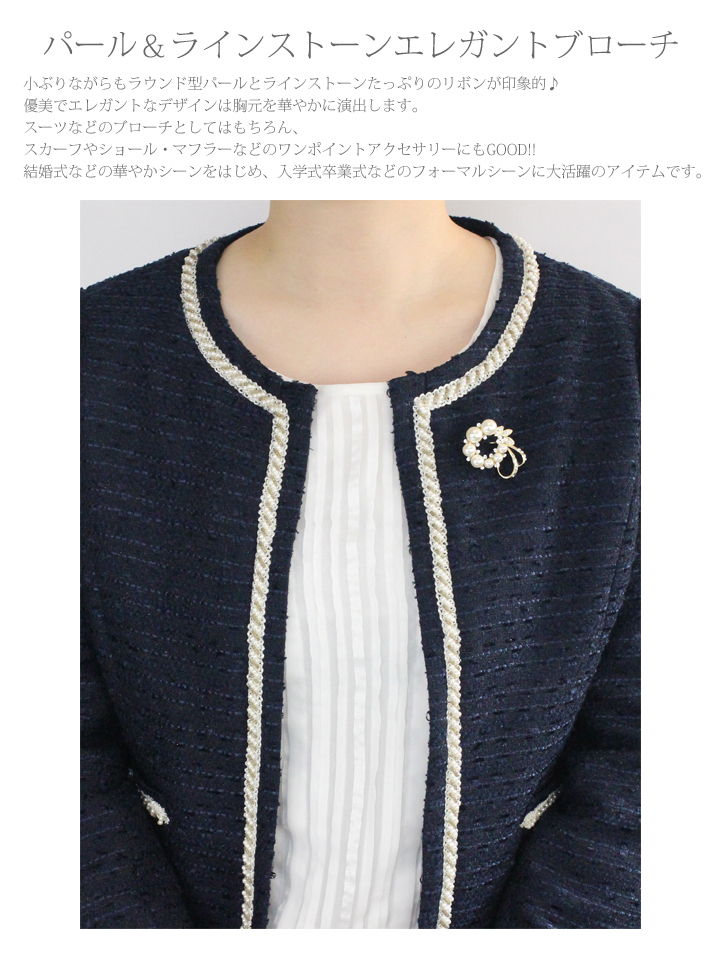 | 商品説明 | 小ぶりながらもラウンド型パールとラインストーンたっぷりのリボンが印象的♪ 優美でエレガントなデザインは胸元を華やかに演出します。 スーツなどのブローチとしてはもちろん、 スカーフやショール・マフラーなどのワンポイントアクセサリーにもGOOD!! 結婚式などの華やかシーンをはじめ、入学式卒業式などのフォーマルシーンに大活躍のアイテムです。 |