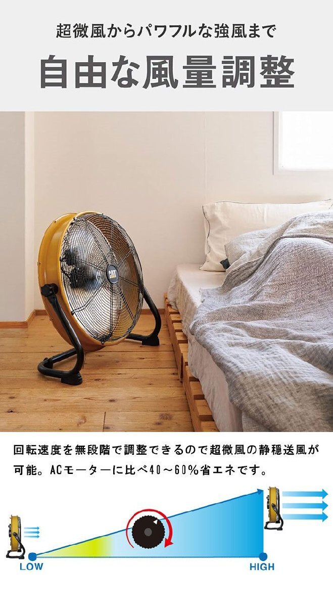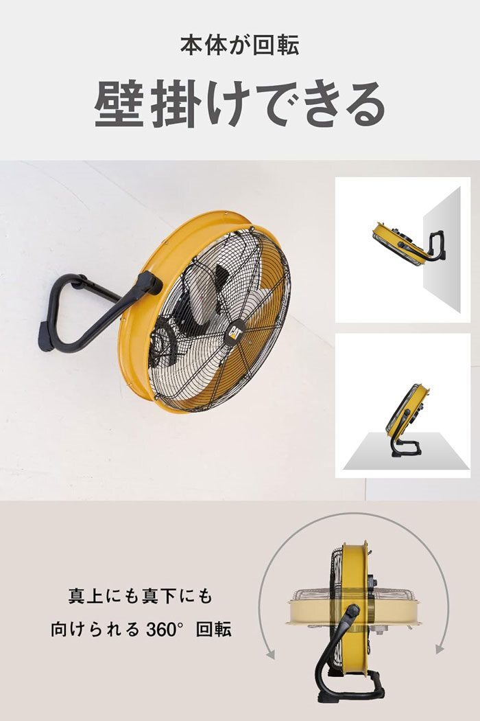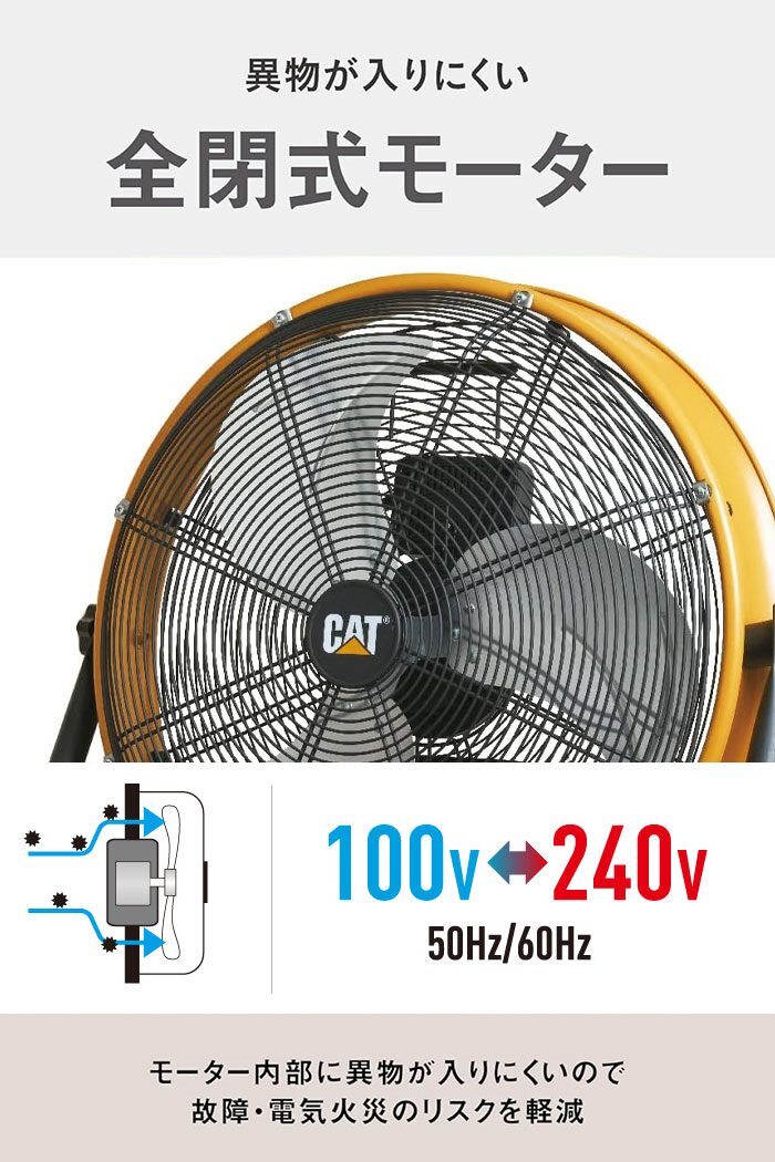 | 広範囲、大風量。 自由に風量調整。 360°回転。 工場扇は、家庭用扇風機と比べてハネが大きく大風量です。 キャタピラー(CAT)の工場扇は、広範囲にやさしい風を大量に送るのが特徴です。 直接風を感じる範囲が広いので、風の届かないところでも体感温度を下げることができます。 空間の広い施設では、エアコンの冷気を隅々まで行きわたらせ、効率的に温度を下げることができます。 様々な環境での使用を想定し、耐久性の高い設計です。 工場や体育館、食品などの生産ライン、作業現場をはじめとした屋内はもちろん、ガーデニングなどの屋外作業の暑さ対策に活躍します。 回転速度を無段階で調整できるので超微風の静穏送風が可能。 ACモーターに比べ40~60%省エネです。 真上にも真下にも向けられ、床置き・壁掛けも可能。 全閉式モーターで粉塵やゴミ、オイルなどの侵入を防ぎます。 モーター内部に異物が入らないので故障・電気火災のリスクを軽減。 電圧100V-240Vに対応しており、電圧の不安定な工場や現場ごとに異なる電圧に対応できます。 50Hzでも60Hzでも能力が落ちません。 |