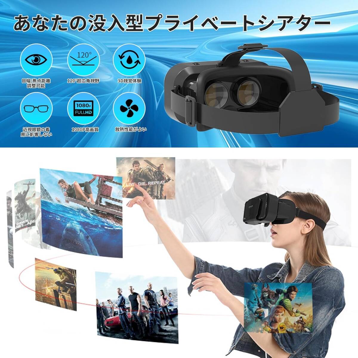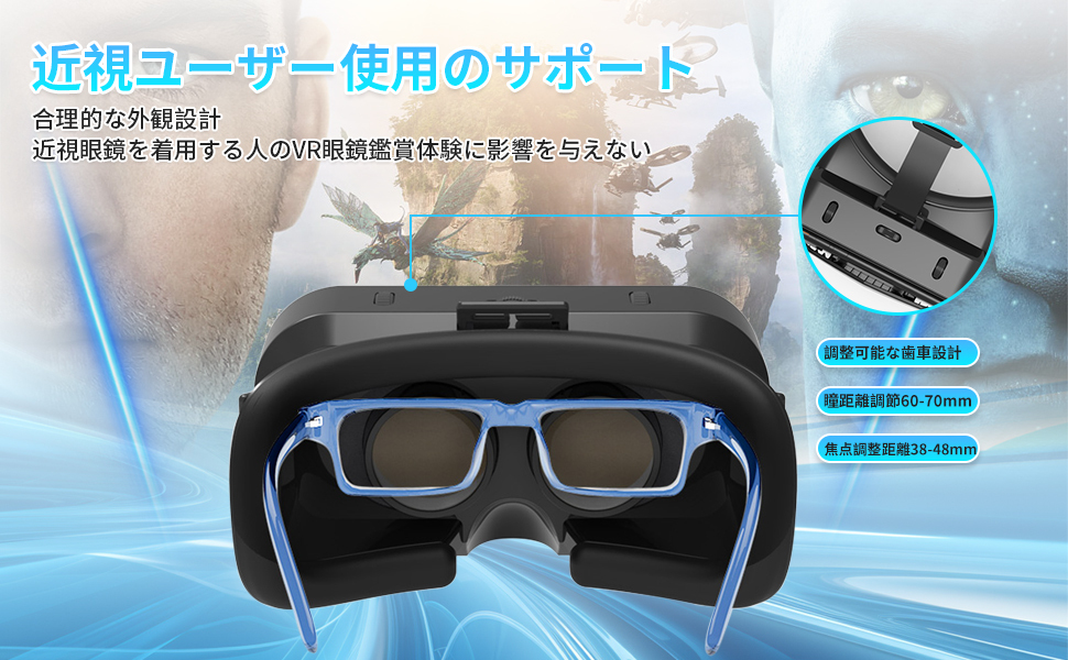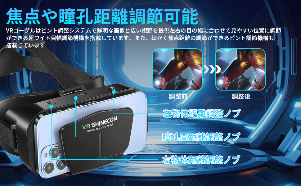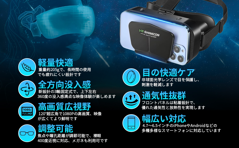 【重要】 ・対応しているインチサイズかどうかを必ず事前にご確認をお願いいたします。 対応インチ: 4.7~6.5インチ またスマートフォンカバーをご利用の際には、取り外してご使用頂く必要がある場合がございます。 ・英語の取扱説明書のみの付属となります。 そのため、ご使用方法につきましては当販売ページ画像をご参照頂き、ご確認を頂けます様お願いいたします。 ※スマートフォンをヘッドセットに装着して、その後ご自身の頭に取り付けて調整するのみとなります。 色ブラック 特徴調整可能なヘッドバンド 付属コンポーネントケーブル 対応デバイススマートフォン オペレーティングシステムiPhone Android など 対応インチ 4.7~6.5インチ 視野角120 度 電池使用いいえ 付属品ケーブル 梱包サイズ約18.1 x 12.7 x 9.9 cm 【使いやすい】 左右の目の間隔調整、左右独立のピント調整も、装着した状態で簡単にできます。 【新登場 VRゴーグル】 新設計な三軸固定式ベルトで、長さも調節可能で、頭にぴったりとフィットするのでズレや落ちる心配もありまん。 上下左右360度全方向の臨場感あふれる映像が楽しめます。 VRコンテンツ再生中に周囲を見渡すと、頭の動きに合わせて視界が360度動き、まるで自分がコンテンツの中にいるかのような仮想体験が楽しめます。 没入感抜群! 【120°超広角&1080P高画質】 このVRゴーグルを使用する時、視野角120度広い(視野角の広さは首を動かずに観賞ことができる視界の範囲を指します)、目に映る映像の範囲が広くなり、視角も広くなり、全面的に映像を感じることができます。 視野が広く、映像をより鮮明にし。同時に業界トップな1080PHD高画質を感じることができます。 臨場感抜群です! 【焦点や瞳孔距離調節可能&裸眼視力が悪い方にもOK】 VRゴーグルのピント調整システムはより鮮明な画像とより広い視野を復元します。 左右の目の幅に合わせて見やすい位置に調節ができる超ワイド目幅調節機構を搭載しています。 また、細かく焦点距離の調節ができるピント調節機構も搭載しています。 広い開口部設計により、眼鏡を装着した状態でも使用可能です。 【非球面光学レンズ&放熱性優】 vrメガネ高品質の非球面光学レンズを搭載し、目を保護できている上で刺激も減少でき、目の疲れを軽減する。 フロントパネルは放熱性に優れた粘着設計で、通気性に優れているのでスマホ使用時の熱を内部から逃し、視界が曇るのを防ぎます、長時間使っても暑さを感じません。 放熱性が抜群! 【心地良い装着感&ンチ幅広い機種対応】 弊社の技術部や生産部は長い時間の研究で、より良い使用体験を提供、直接に目に当たる部分は顔に跡が付きにくいPUクッションを採用。 重量はわずか約205g本体、長時間使用しても首に負担がかからない上で、首や頭が疲れが減少できます。 4.7~6.5インチまでのスマホほぼ全機種対応、androidでもIOS機種でも。 普通より小さいサイズか大きいサイズにもスマホでも簡単に調整することができます。 |