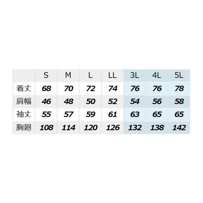 | サイズ | 3L(着丈76、肩幅54、袖丈63、胸廻132)cm 個装サイズ:60×40×7cm |