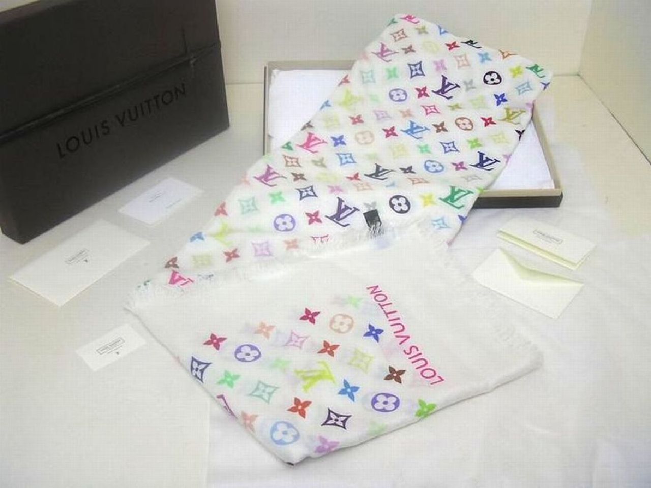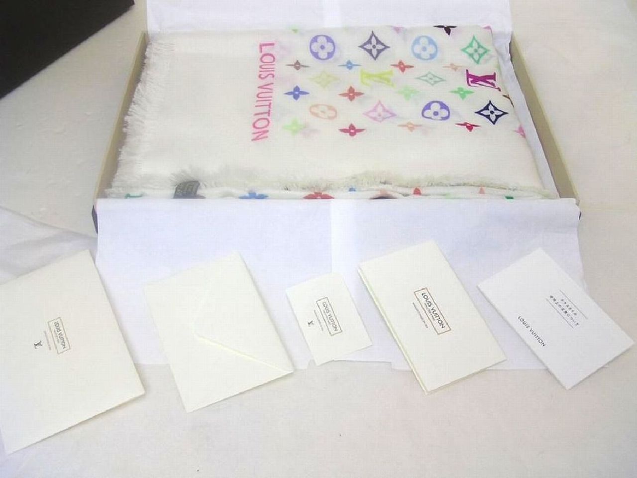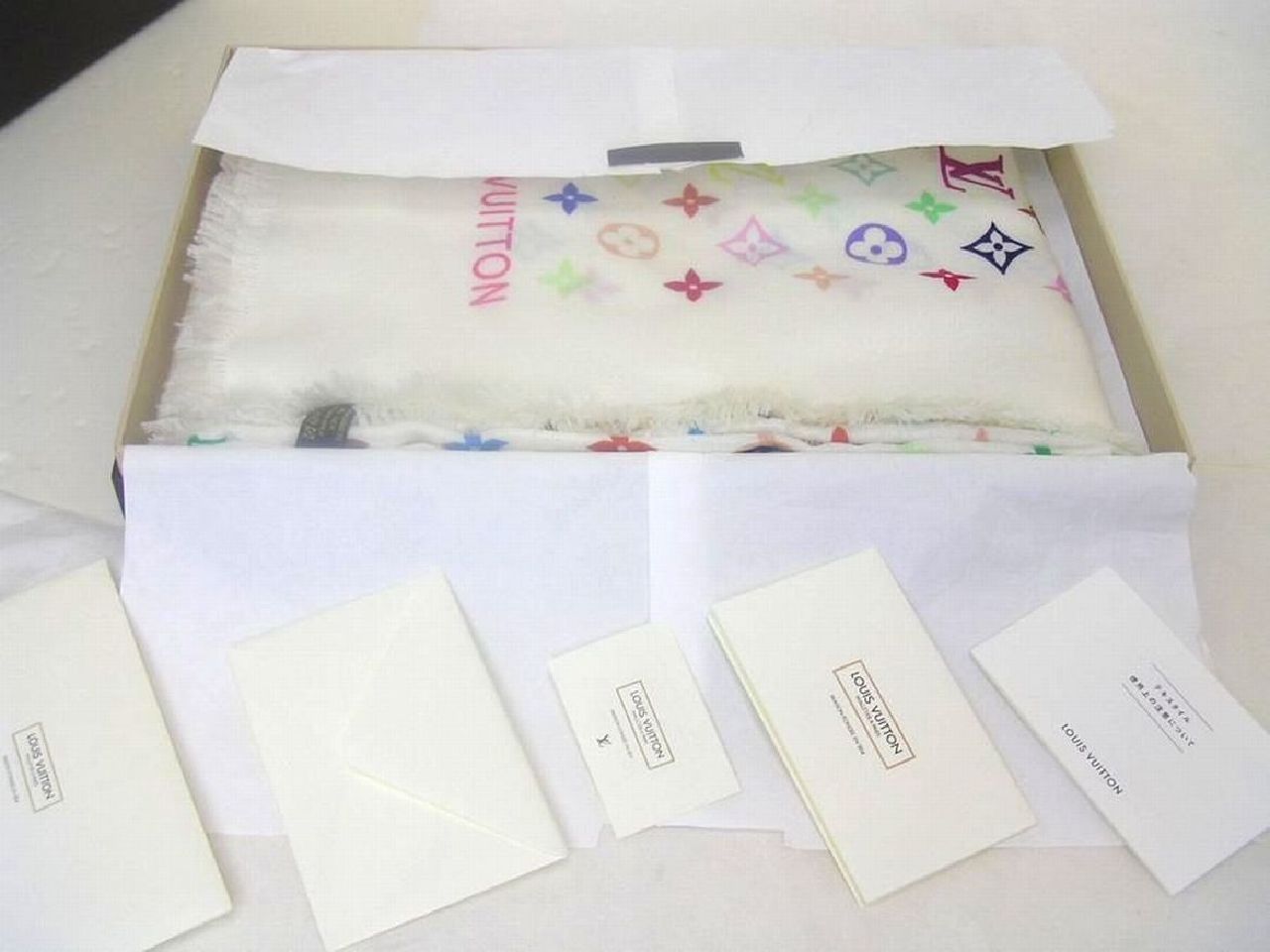 | お立ち寄り 有難う御座います ワンワンです (〇) 初めに 前回 迅速なお取り引き戴いてます皆様は 中ほど 項目 ■ 製品シリーズ・出品 本体・附属品 などに ジャンプ 移動 ください (〇) 改めまして この出品は 落札者様 !へお支払い 商品 受け取り連絡後 商品代金など受取り可能になる出品物です お支払方法 !かんたん決済(銀行振込み・クレジットカード・コンビニ払い・PayPay決済など) 落札者様 !へお支払 → 出品者 発送 → 落札者様 受取連絡後 → !へ商品代金など支払申請 落札者様が受け取り連絡されない時は 商品代金など出品者受け取り出来ますのは 19日後前後で御座います 入札はご配送先に商品ご到着 その後 2日以内にシステム受け取り連絡されます方のみでお願いします もし満たされない場合も出来るだけ私から催促致しませんが新たなお取引遠慮しますことはご了承ください 発送 決済確定日お時間によりまして 当日 又は 翌日 発送させて戴く出品物です 消費税はお預かりできません お支払い かんたん決済 送料と落札額 落札後 購入手続開始・決済完了は 落札日・休祝日を除く 2日以内で御座います こちらを満たされない場合ナビ連絡 その後 落札者様都合の削除します 入札前ご連絡くださいまして予め合意 厳守してくださいます方は ご案内限りではありません (〇) !落札ガイドを1度も既読ご確認されてない場合や!初めての方は この文字列クリック !落札ガイド商品ページ確認ポイント 4.※ 他同落札ガイド 03~05 など全般1度はご参照ください (〇) 商品 出品の多くは 世界を代表致します有名ブランド品 綺麗なお品 未使用品 珍しい御品 又 激レア限定未使用品 自身のコレクションとして国内直営店にて購入させて戴いた希少限定品も存在 完全湿度管理・完全未展示品 (〇) 出品 こちらは ルイ・ヴィトン 限定マフラー ストール ショール 商品説明フォローコメントなど既読ご自身の希望に合っているかを入札前にご確認ご判断してください フォローコメントは この文字列クリック 全出品物ページ1番上に御座います (〇) 他の私の:ID wan_wan_678 を含む 今までに適確な取り引き戴いてます方を除く 日本文章に慣れてない方 (The person who is not used to Japanese, a Japanese sentence) 翻訳ソフトでなく(no translation software)記載商品説明ご案内日本文字文章など日本人同等に理解できる方 又は日本人同等の解釈 助言 又は代筆 代理会話して戴ける方が そばにいらっしゃる環境の方のみでお願いします 上記 環境でない場合 入札避けてください。 (〇) ルイ・ヴィトン 村上隆 マルチカラー 限定服飾品 用途はさまざま幅広く ストール マフラー ショール ブランケット ひざ掛けなどに 生地は 拡げれば大きく長くも たためば小さくも短くもなり 厚くご使用薄く その活用方法もさまざまと思います 活用は 巻いての使用 肩に掛けて 膝に掛けて 全体全面に掛けてなど さまざまな形 方法で活用戴ける御品 たたんで掛けて ストール ショール ブランケット ひざ掛け 巻いて マフラー 色んな用途で活用 名付けてください 以下通常文です ■ Takasi Murakami by Louis Vuitton ■ ■ ブランド本国・生産国・製品 Paris Louis Vuitton Made in France 限定ショール ストール マフラー □ 画像説明 出品 未使用品 ご案内をメインに画像を拡大 その後縮小 現実サイズでご覧ください 綿手袋使用 お写真では白い糸又点の繊維など付いて写ってる場合が多々御座います □ 記載説明 正確な記載ご案内に努めてますが 全ての方にご満足戴くのは不可能と思います 不明重要な点は 項目 (◆) ご覧くださいまして入札前にご質問ください その他 出品者情報など全般をご覧くださいまして総合でご判断をお願いします ■ 製品シリーズ・出品 本体・附属品 村上隆 ルイ・ヴィトン コラボ 限定マルチカラー ショール ストール マフラー 未使用品 附属品、 Louis Vuitton 純正箱BOX / 国内直営店タグ / 取り扱い説明書 / メッセージカード / Louis Vuitton 附属品封筒 / (上記 限定コラボ マルチカラー ショール 未使用品 本体・フル附属品) (箱は厚紙製傷すり傷など傷みから逃れのは不可能です予め配送用又は保管用とお考えお願いします) (箱内内紙) 箱内の内紙は破れしわなどできます出来るだけそのままでオリジナルを優先と思いますが 新しい薄葉紙に交換させて戴く時はあると思います予めご了承又はご理解をお願いします (箱内ゆれ止め) 購入ブランド店舗の梱包方法よりまして配送中環境やもしもの落下など箱内で前後左右にゆれる可能性があります できるだけ前後左右上下にゆれにくい様素人なりの工夫させて戴く時はあると思います予めご了承をお願いします (梱包資材及び梱包発送など) 完全未展示品発送 発送前に再度確認 問題のない場合 この御品に適した箱を用意 通常破損しない様気を配り梱包発送させて戴こうと思いますが 全ての方にご満足戴くのは不可能と思います 予め素人梱包のご了承お願いします (外箱) 純正BOX箱は角が弱く配送用又は保管用などと記載させて戴いてますが 配