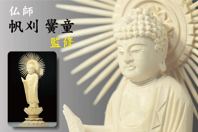 | 阿弥陀如来立像 蓮華座 白木製 浄土真宗 大谷派 御本尊 6寸 大仏師 帆刈黌童(ほかり こうどう)監修のご本尊シリーズ。一木造り、やわらかな木肌の白木製お仏像。モダン仏壇やミニ仏壇にもご安置しやすい大きさ、各宗派をご用意しております。 木彫像に寄せる大仏師の想いと共に、職人による丁寧な仕上げが一体ずつ施されています。優しいお顔の仏様、安らぎと平穏を享受し故人への感謝をお祈りいたします。 仏身の台座、蓮華座(丸台座)は仏様の優しいイメージをそのままに柔らかな曲線美、満開の蓮の彫刻。反り返った花びらを重ね合わせた、とても手の込んだ造りとなっています。仏身から放たれる一丈光の光背もまた、細部まで彫り込まれた職人の仕上がり。 天然木素材で作成されているため、木目や色合いに個体差がございます。年月の経過とともに飴色になり、仏像独特の風合いが出てまいります。 お届け当初の木目や色合いは目立たなくなりますのでご承知ください。 お仏像は仏壇中央にある須弥壇の上に安置いたします。ご購入の際は事前に奥行、天井までの高さをご確認ください。 帆刈 黌童 <大仏師・名古屋市> ■主な作品 平成 9年 鎌倉長谷寺より仁王像修復 大善寺(東京) 平成10年 日蓮聖人像 瑞光寺(東京) 平成11年 弥勒菩薩像 開法寺(北海道) 平成11年 烏枢沙摩明王像 開法寺(北海道) 平成12年 弘法大師像 成田山深川不動堂(東京) 平成12年 聖徳太子考養像 成田山深川不動堂(東京) 平成14年 大日如来像 成田山深川不動堂(東京) 平成17年 仁王門仁王像 弘誓寺(宮城) 平成17年 如意輪観音像修復 安養寺(宮城) 平成23年 不動明王 座像一丈八尺 成田山深川不動堂(東京) 平成24年 池上本門寺御本尊 日蓮大聖人模刻 法妙寺(長崎) | |||