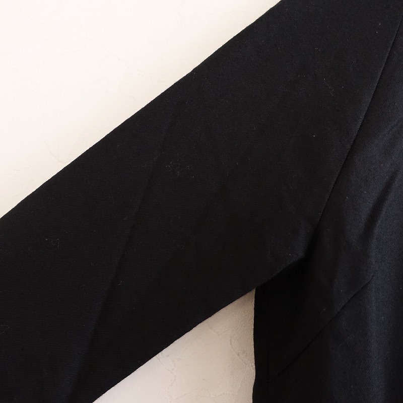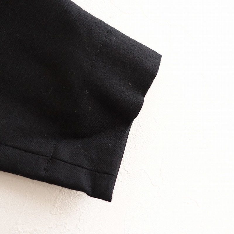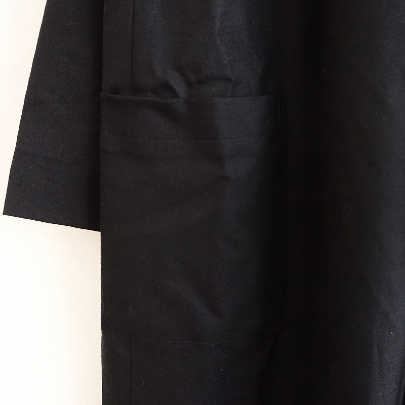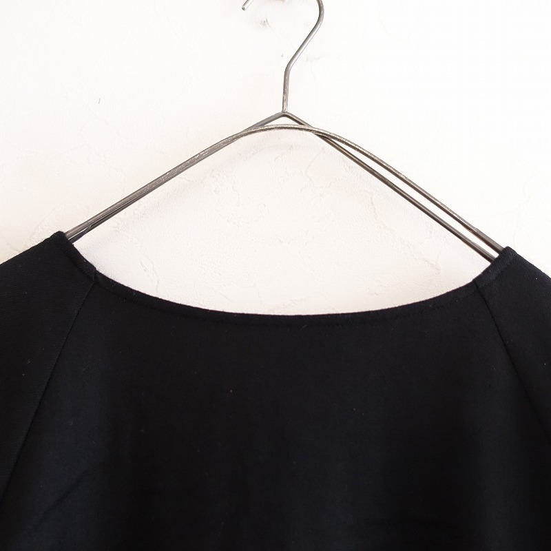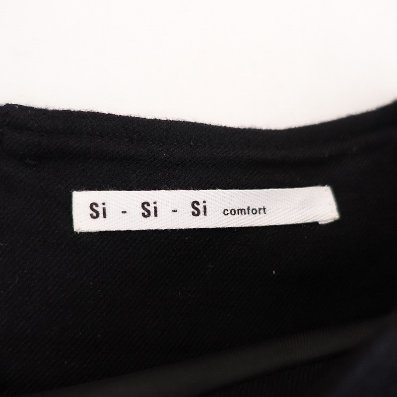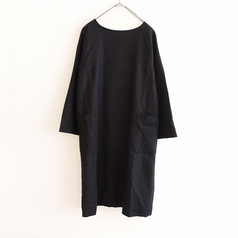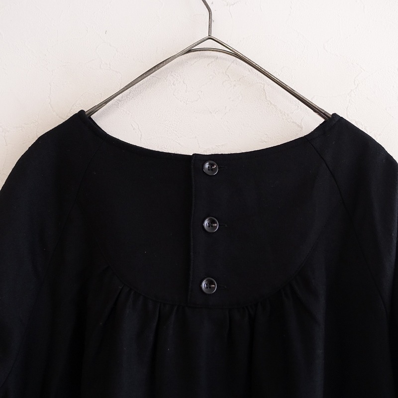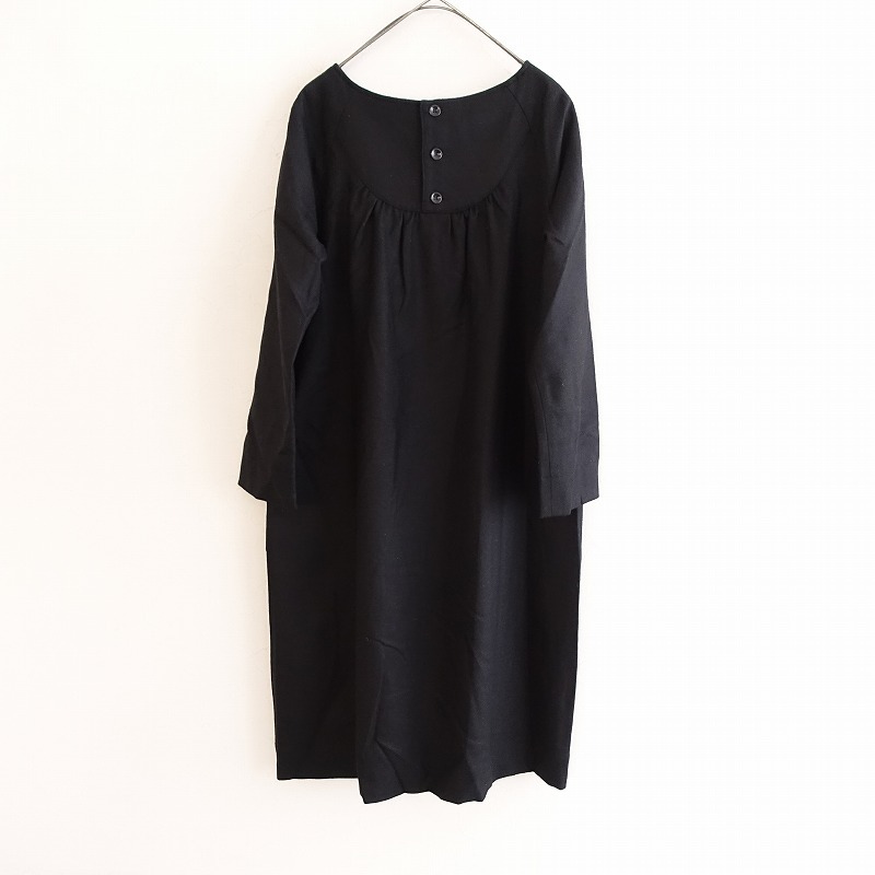 | si-si-si comfortのウールノーカラーワンピースです。カラーはブラックで、ウールのツイル地です。背上部にギャザー切り替えが施されており、バックに半開ボタン付きのプルオーバータイプで着脱できます。前腰左右にパッチポケットがあり、裏地付きです。 |