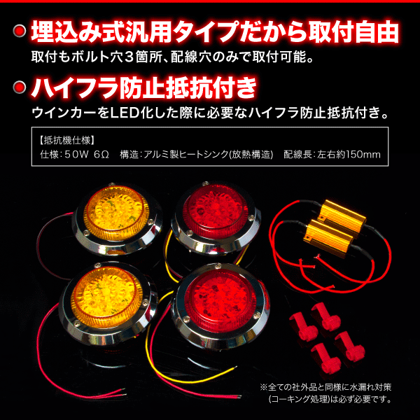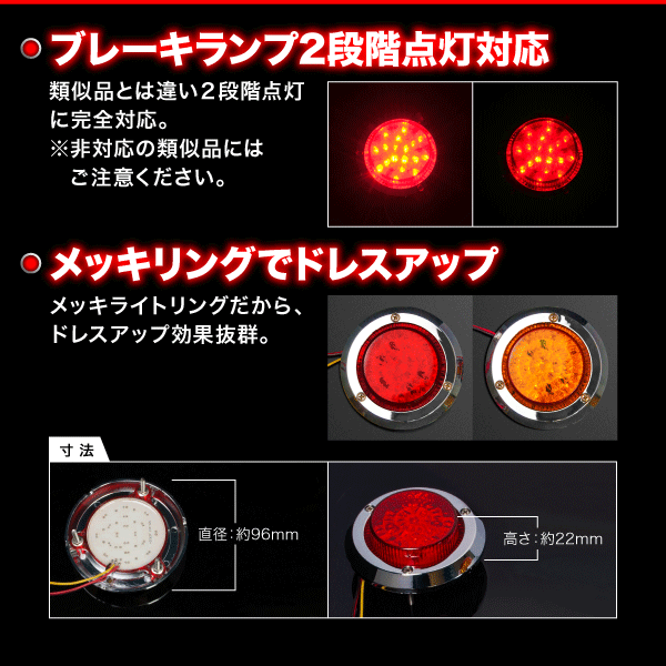| 仕様 | ・12V車専用 ・埋め込み式の汎用品でどんな車種でも取付可能 ・ブレーキランプの2段階点灯可能 ・ハイフラ防止抵抗機付 | サイズ | 直径:約96mm 高さ:約22mm 配線:約200mm |